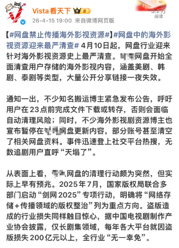 又来了,某克网盘要清海外剧。看样子不仅是要停止继续分享,更是要删除之前的分享内容。已经看到多个群讨论压制组、字幕组账号都被封禁了。网盘禁止传播海外影视资源