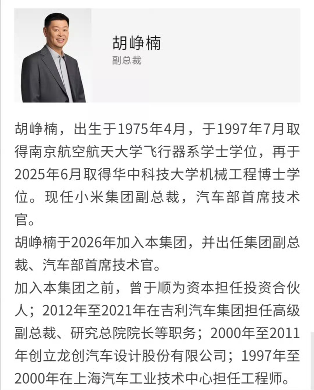看了下官网已经更新了,恭喜胡峥楠升任小米汽车CTO