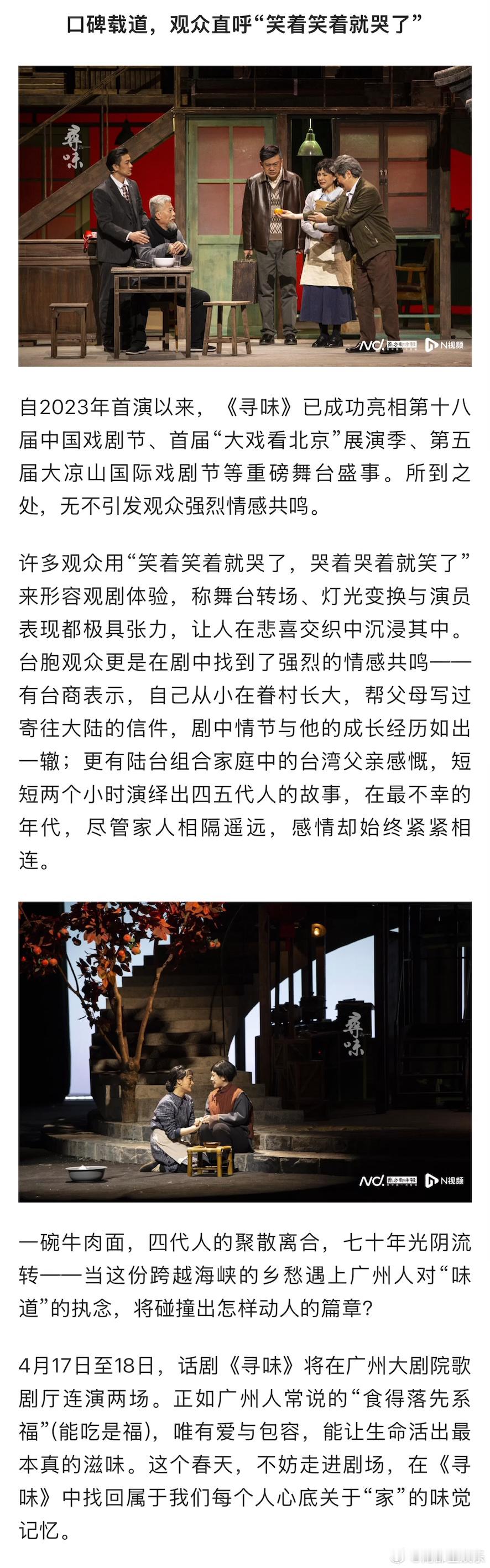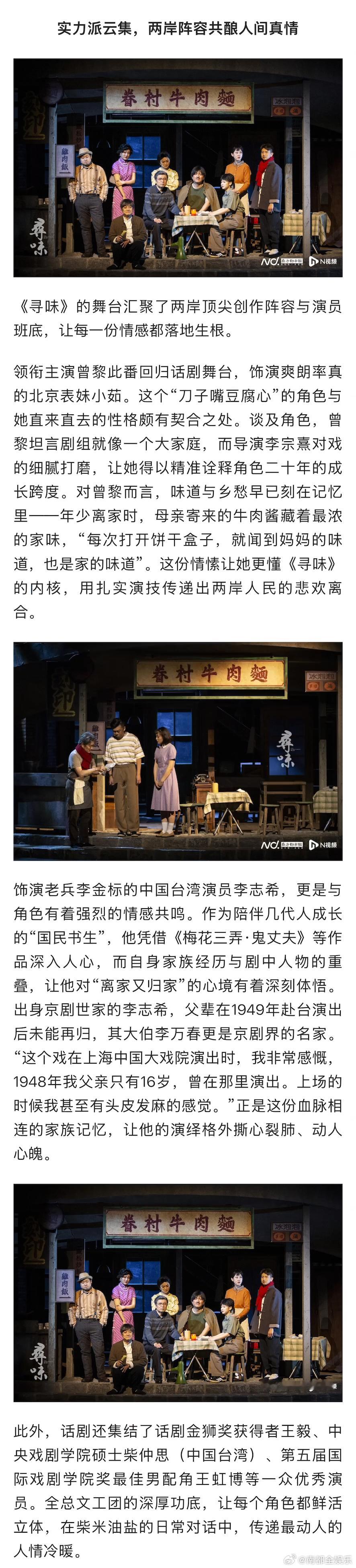【一碗面,两岸情:曾黎、李志希领衔话剧《寻味》四月登陆广州大剧院】“味道从来都不只是味道,更是一段段难忘的回忆。”2026年4月17日至18日,由中华全国总工会文工团出品,曾黎、李志希(中国台湾)领衔主演的话剧《寻味》将在广州大剧院歌剧厅温情上演。这部横跨七十年、串联两岸四代人悲欢离合的舞台力作,以一碗牛肉面为引,讲述了一段关于乡愁、亲情与和解的动人故事。话剧寻味李志希曾黎