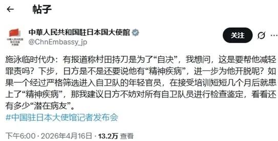 有意思的是,中国驻日本大使馆早在16日就猜准了这个剧本,直接发文调侃称,“既然要查精神病,不如对整个自卫队来一次全面评估,看看有没有更多‘潜在病友’。”