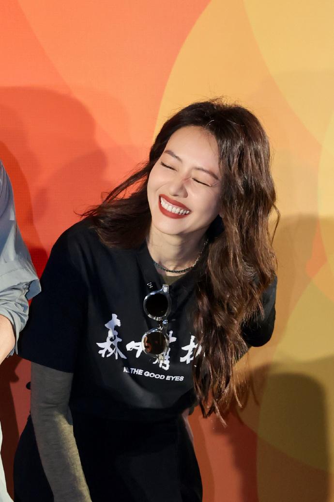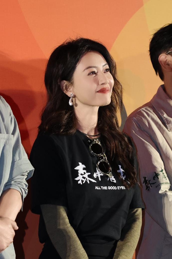 高圆圆里面穿卡其色T恤,外面套着黑色的字母风T恤,两件衣服叠穿的效果很不错。