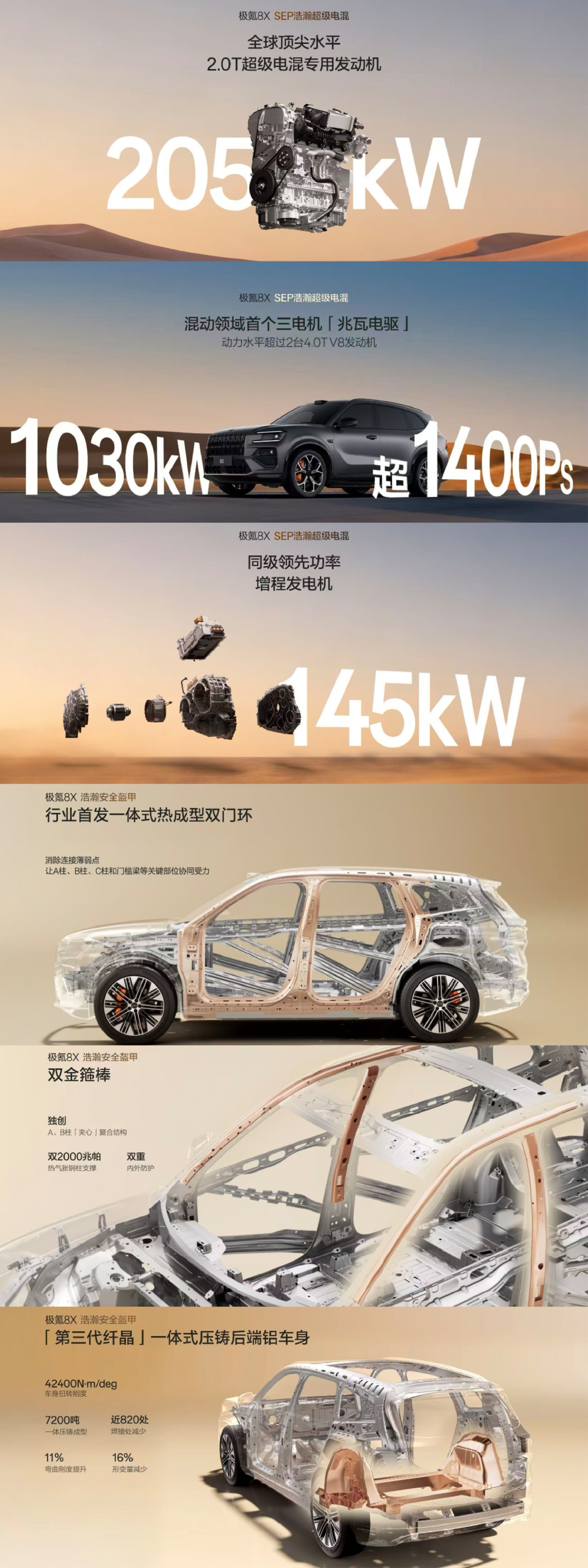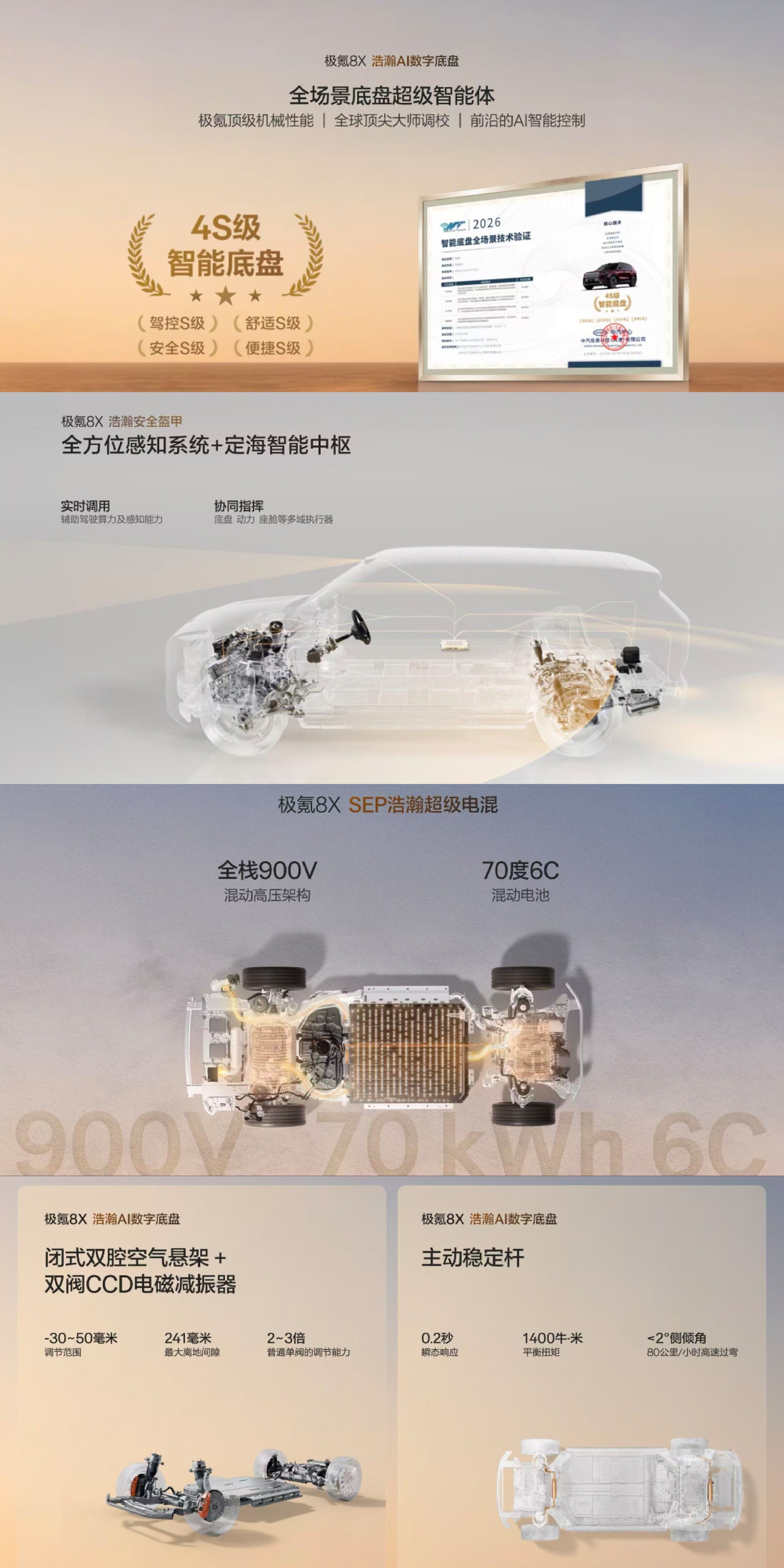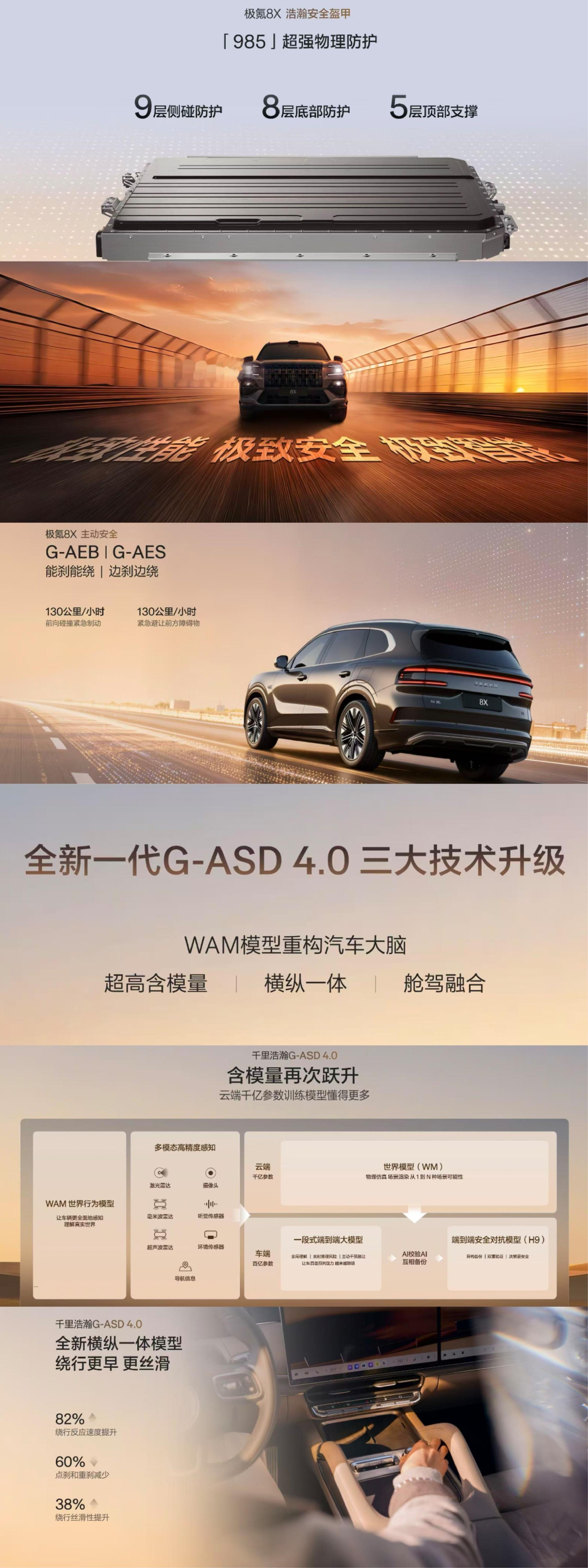 如果说超级Eva是“全能助理”,千里浩瀚G-ASD 4.0则是“超人司机”,决策速度是人类3倍,操控灵活度提升3倍,能实现99%全场景无断点覆盖,更有着无图漫游与AI终点领航的突破性功能,搭载车身的激光雷达、传感器,感知与算力堪称行业顶尖。性能层面,极氪8X同样不负“新公路之王”之名。基于浩瀚-S超级电混架构与900V高压平台,顶配曜影版搭载三电机兆瓦级电驱,零百加速仅2.96秒,为全球最快混动SUV,兼顾超跑性能与旗舰舒适,且支持6C超快充,补能效率方面行业领先 。