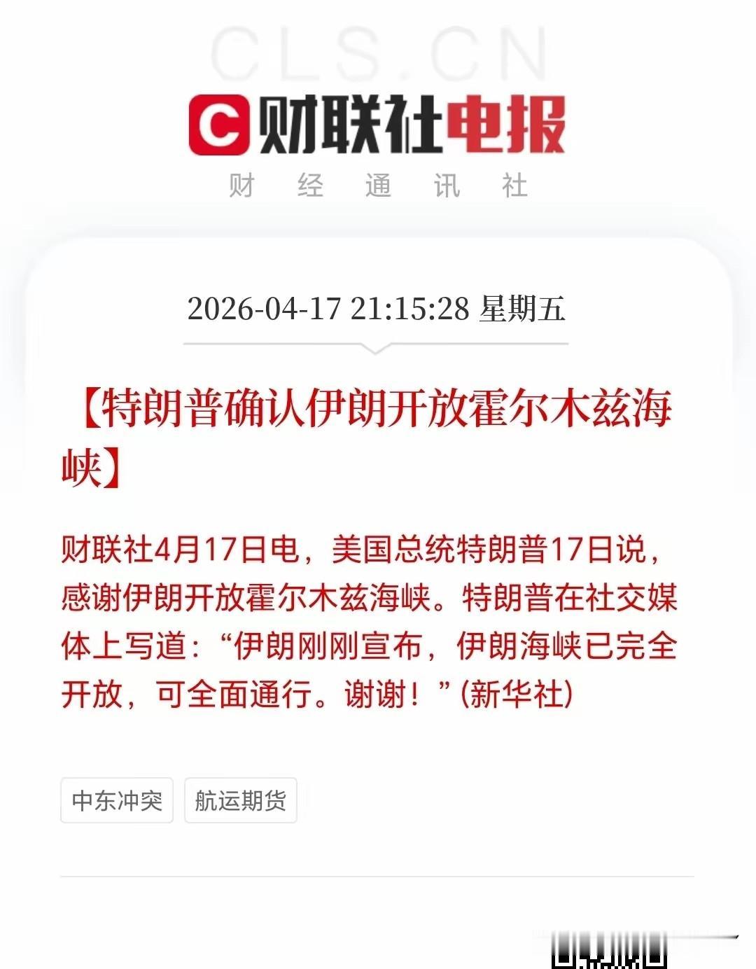 需要明确的是,此次临时停火放开航运,只是和平进程的第一步,后续美伊双方还将围绕核协议、地区安全、能源贸易等核心议题,稳步推进后续谈判。但从当前局势来看,双方已经释放出足够的和解诚意,中东地区全面永久停战,已经近在眼前,持续数月的中东乱局,终于要画上圆满的句号。