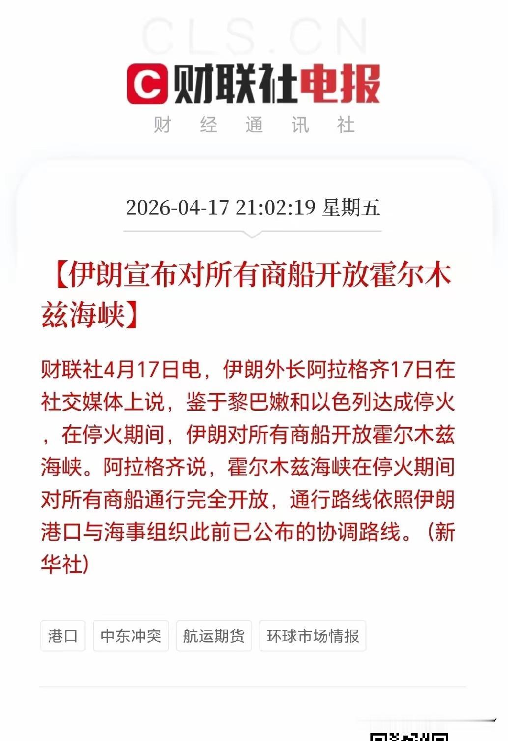 4月17日,伊朗正式对外官宣,在黎以临时停火窗口期内,全面放开霍尔木兹海峡全部航运通道,不再设置任何通行限制,全球最重要的能源大动脉彻底恢复畅通,持续紧绷的中东战火,终于按下暂停键,迎来永久停火的关键转机。