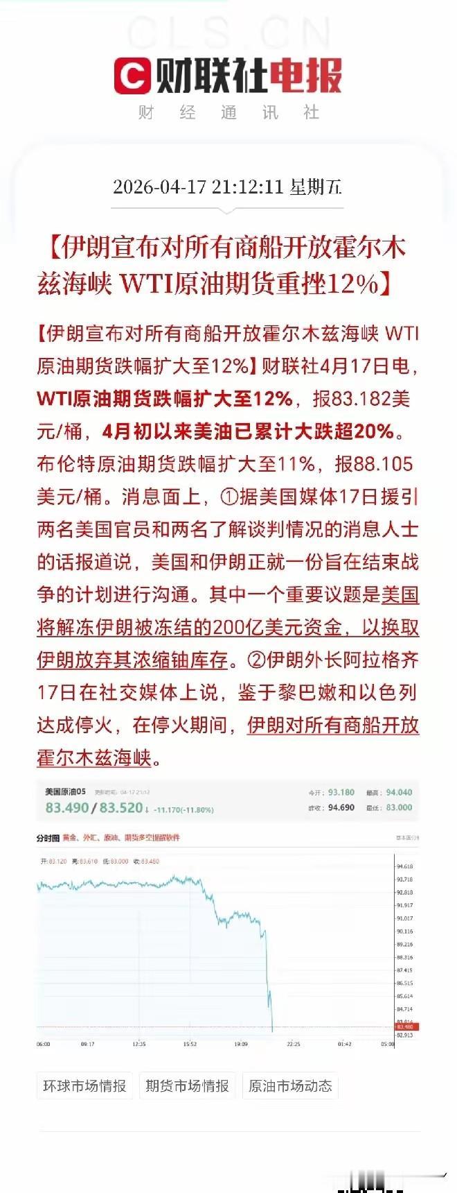 霍尔木兹全面解封!美伊战争迎来终局,油价今夜暴跌破80美元!