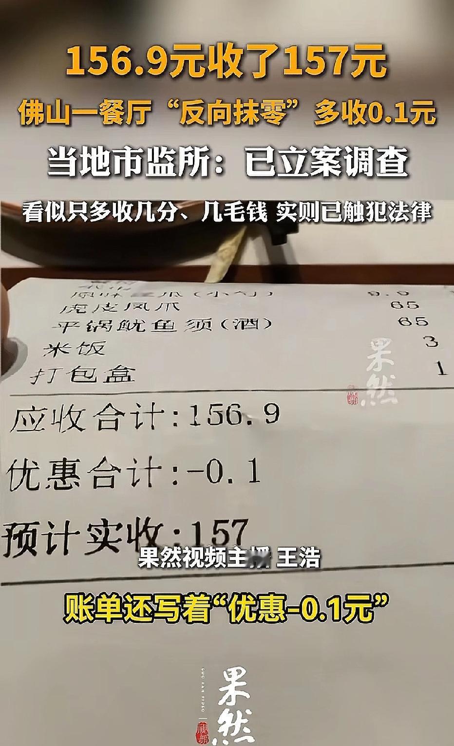 广东佛山,一餐饮店竟把结账系统直接设成向上取整!一食客消费156.9元,收据单却标注157元,优惠合计-0.1,商家靠“反向抹零”硬生生多收1毛钱。顾客当场怒怼:数学上说得通,做生意可没这个道理!目前,商家已被立案查处。