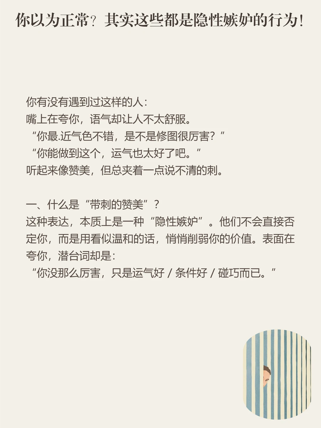 但他们又不愿意承认自己的嫉妒,于是换了一种更“体面”的方式表达——一边夸你,一边把你拉回和自己差不多的位置。