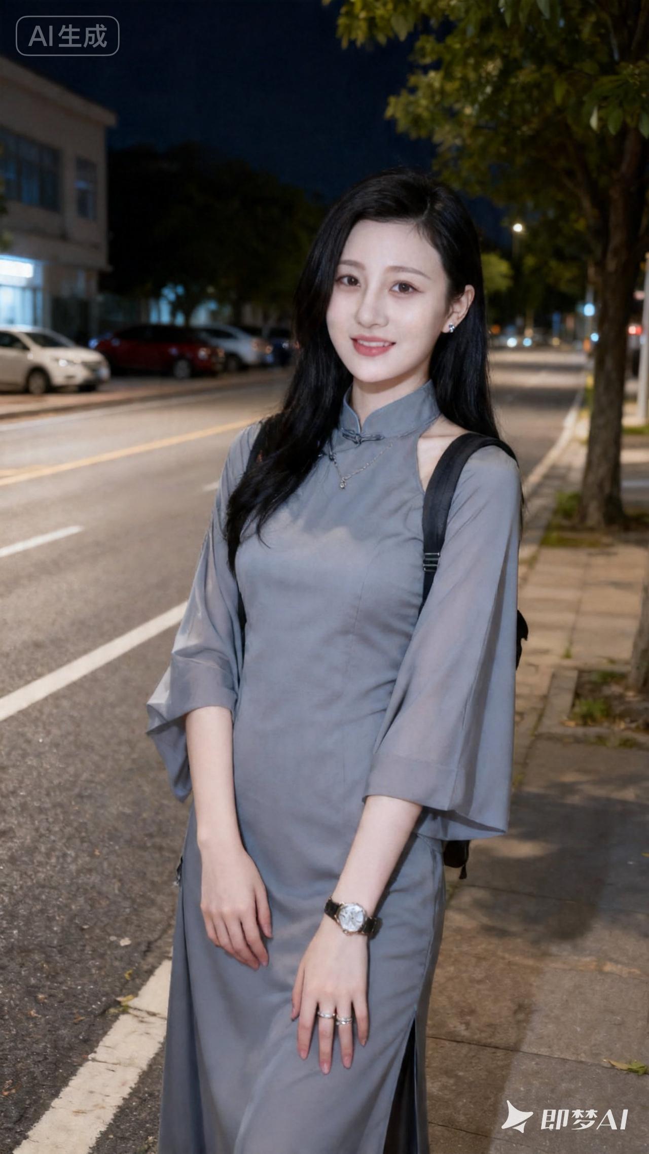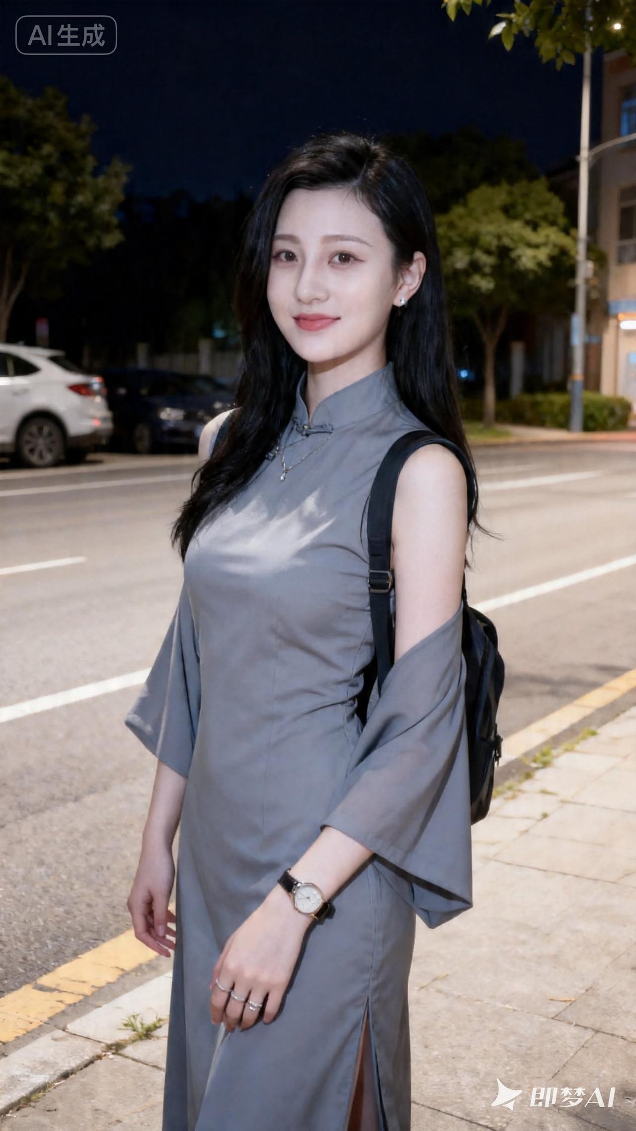 夜色中的优雅,灰色连衣裙与黑色背包的完美搭配,尽显都市女性的时尚魅力。