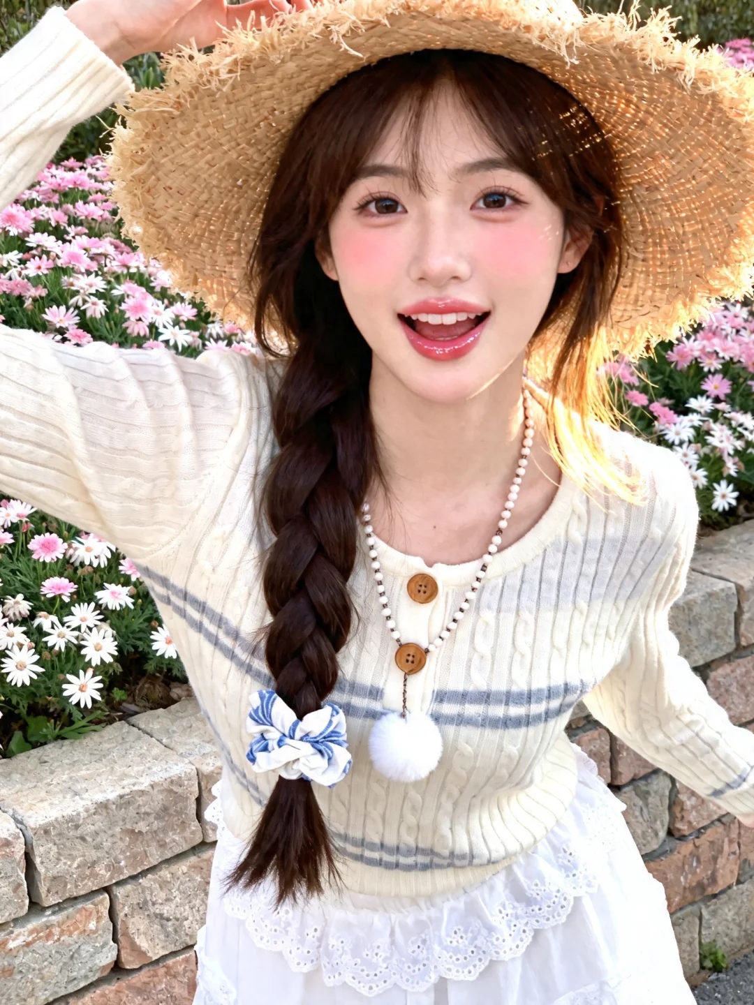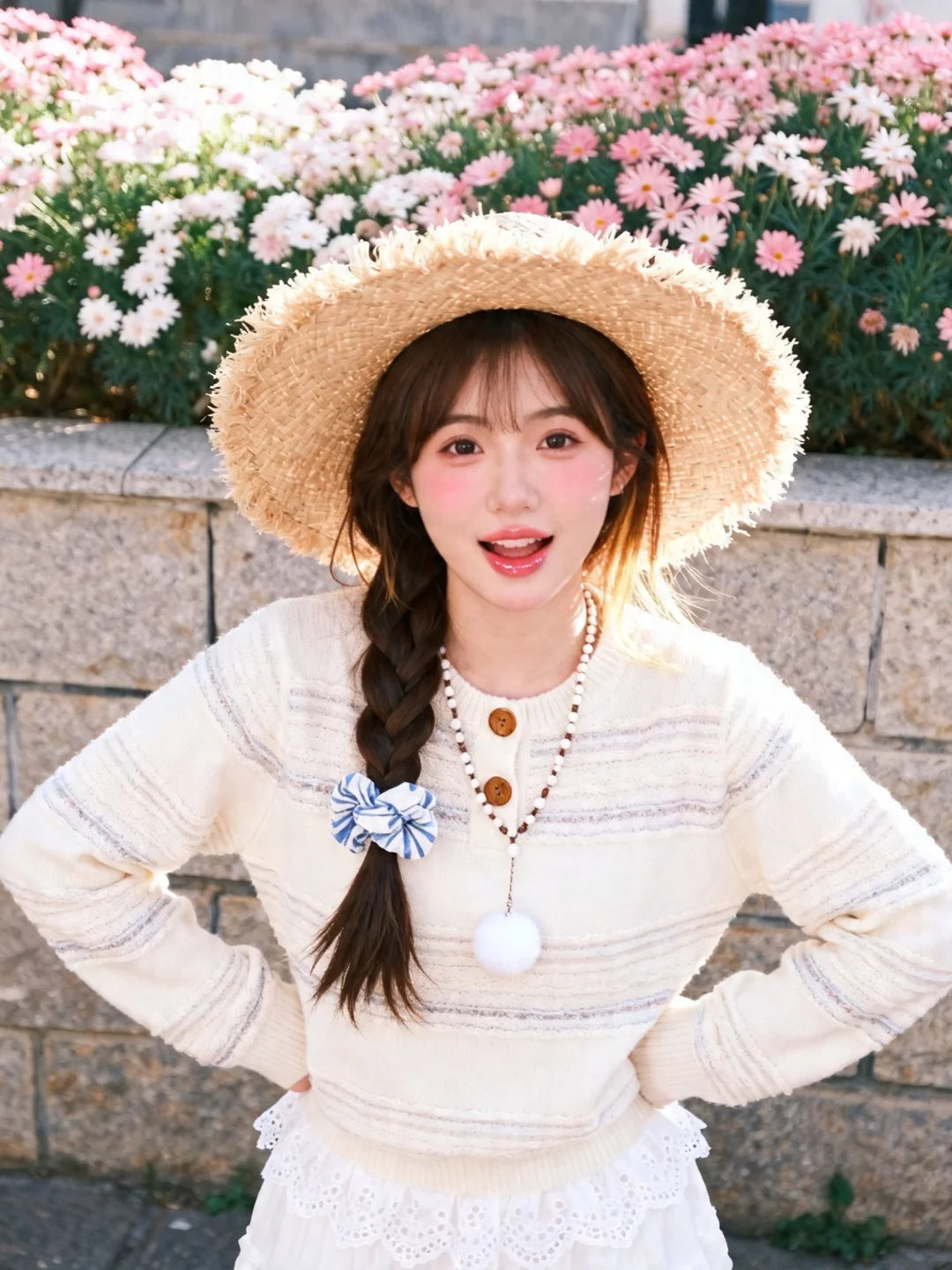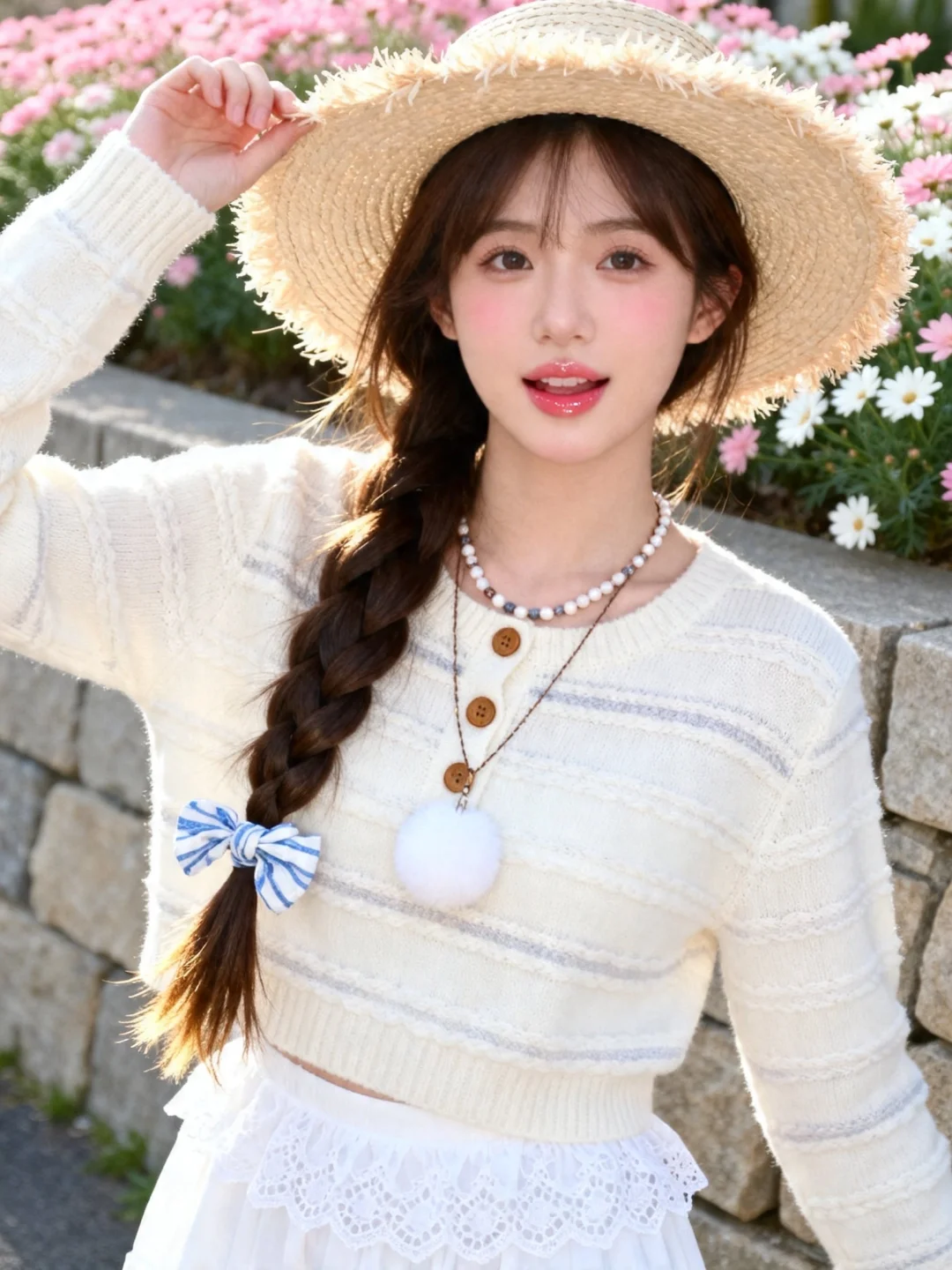 春日户外人像写真,冷白皮年轻可爱女生,元气甜妹妆容(淡妆腮红+透亮唇蜜),深棕长发编单侧麻花辫(辫尾用蓝白布艺发饰固定);身着奶白色镂空针织衫:衣身有条纹肌理镂空设计,领口木质纽扣装饰,下摆露出白色蕾丝裙摆;配饰为串珠项链(搭配白色毛球吊坠),头戴宽檐毛边草编帽;她动作随机自然,表情自然俏皮可爱,背景是石砌矮墙+粉白小花丛,光线为春日上午柔光(均匀打在面部,发丝边缘泛浅金光泽);整体色调是奶白+浅粉的低饱和清新调,画质8K超高清(针织镂空纹理、草编帽毛边细节、发饰褶皱清晰),风格是‘森系甜妹日常’,镜头:Canon M50 + 22mm f/2,轻微胶片颗粒感,焦外背景虚化保留花朵轮廓,氛围活泼温柔。