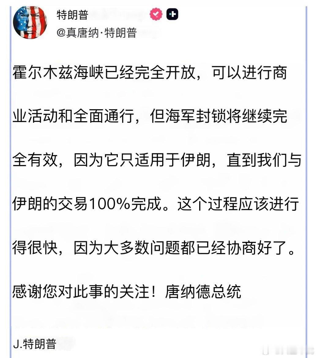伊朗开放霍尔木兹特朗普发帖说谢谢伊朗特朗普称对伊海上封锁继续有效