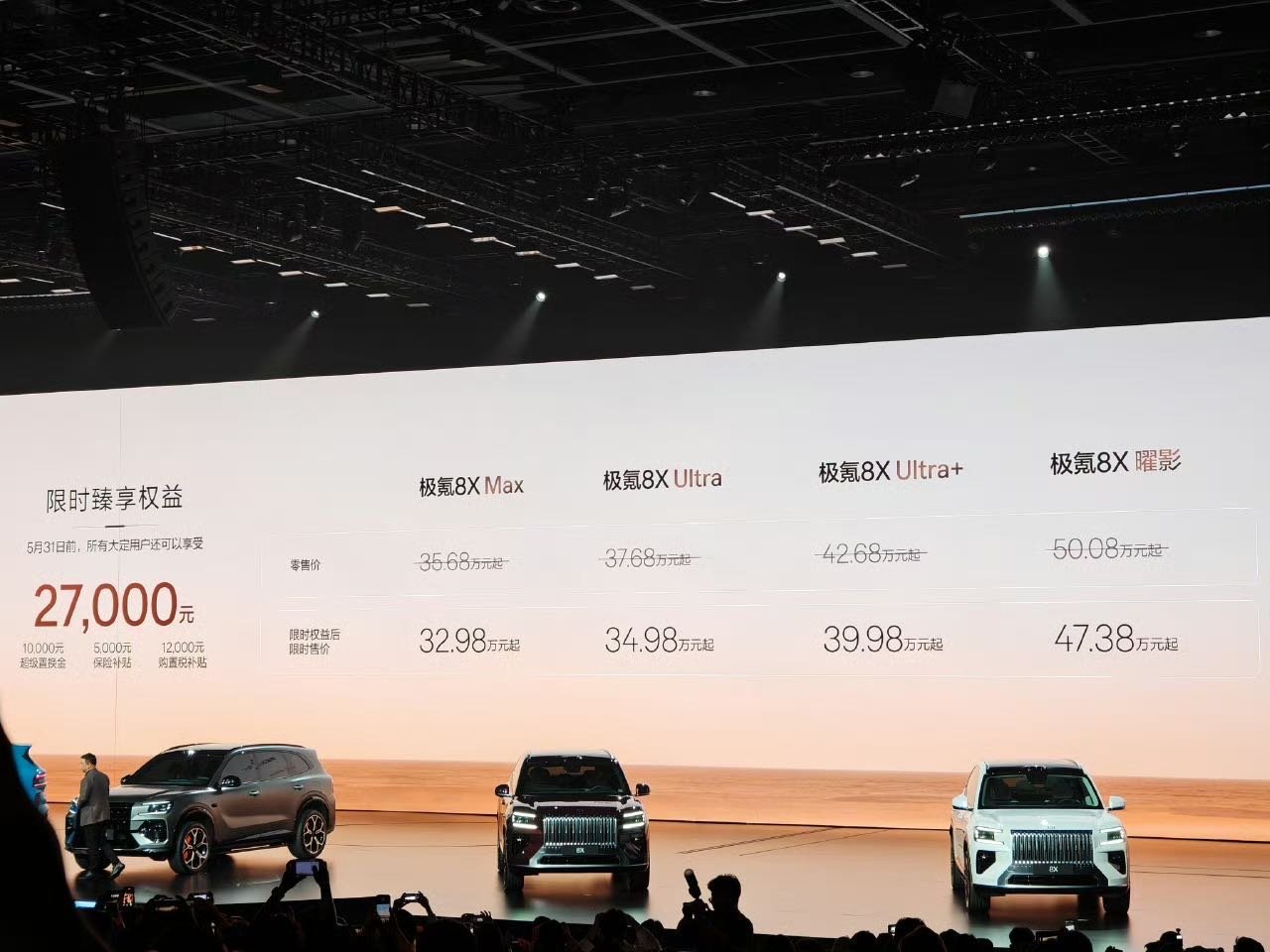 极氪8X价格来了,限时权益后的限时售价:极氪8X Max:32.98万元起极氪8X Ultra:34.98万元起极氪8X Ultra+:39.98万元起极氪8X 曜影:47.38万元起极氪品牌新车首任车主增换购,连续5年赠送1,000度/每年免费充电额度,这个价格你觉得怎么样?新公路之王极氪8X正式上市极氪8X