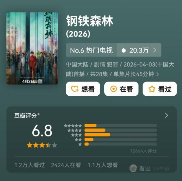 鞠婧祎《月鳞绮纪》豆瓣开分5.3,不及格,3万人打分,李昀锐《冰湖重生》豆瓣开分3.2,低到离谱,且只有8500人打分,迪丽热巴《白日提灯》豆瓣开分6.7,及格了,8万人打分,魏哲鸣《你是迟来的欢喜》豆瓣开分7.1,1.3万人打分,井柏然《钢铁森林》豆瓣开分6.8,1.2万人打分。