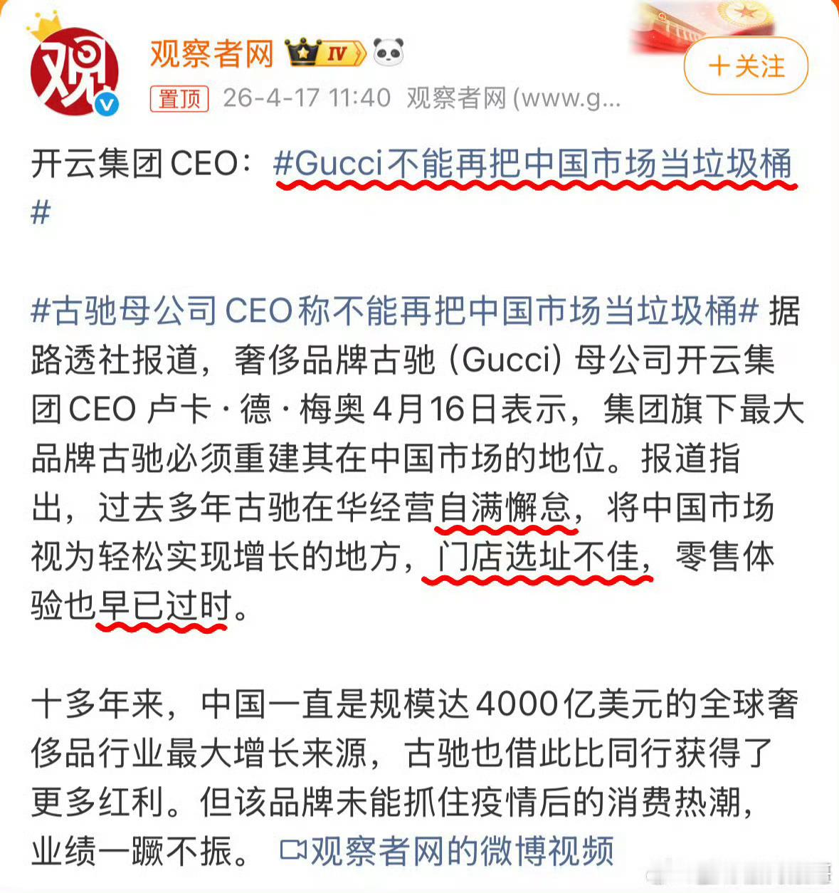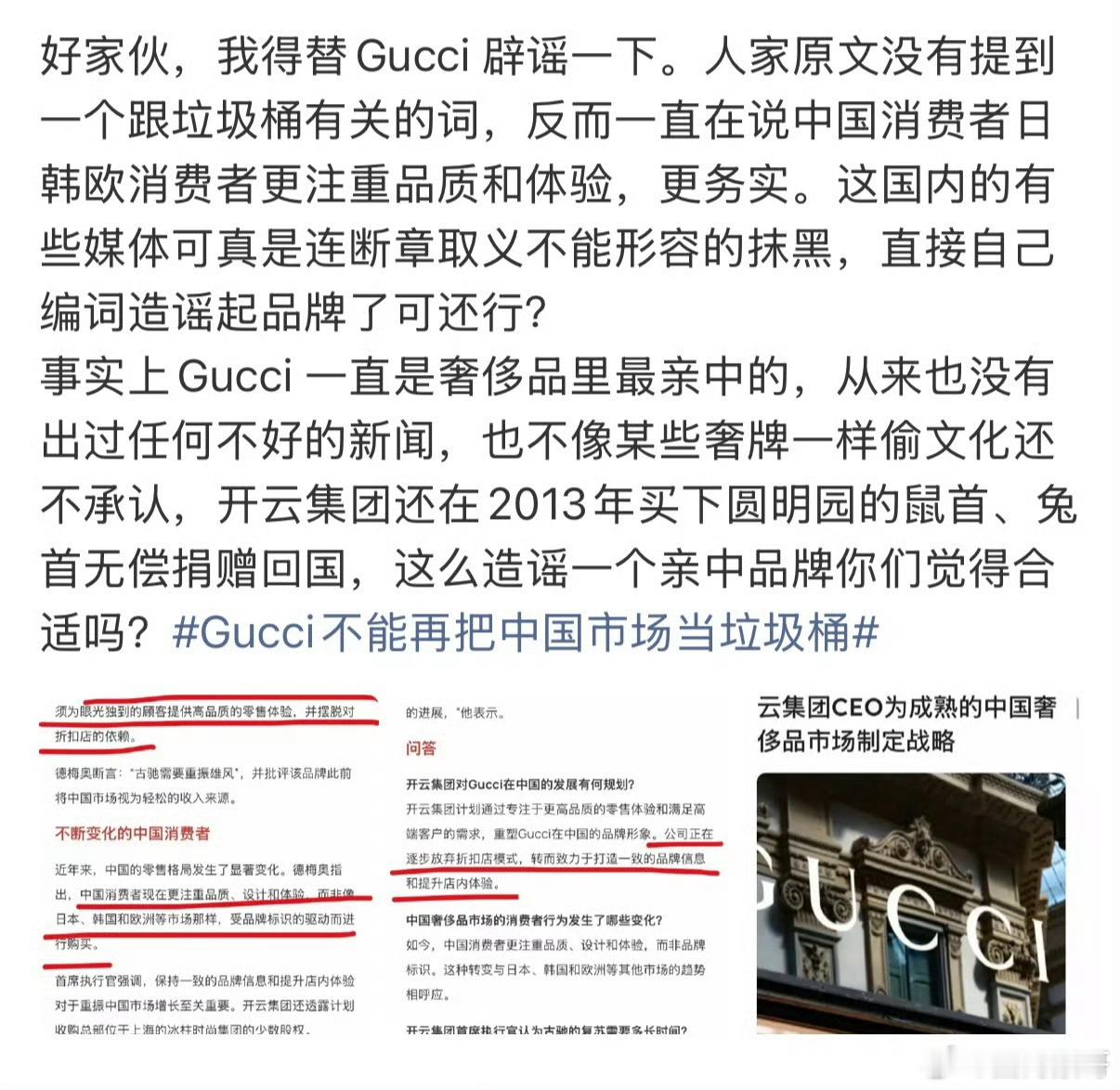 Gucci不能再把中国市场当垃圾桶CEO原文哪里这样说了啊,就忙不迭地弄个词条造谣?人家原文里根本都没这样说,只是表示要转变战略重塑品牌更加注重店内品质体验,以应对风起云涌不断变化的中国市场。这种乱zy的这不就是标题党吗?