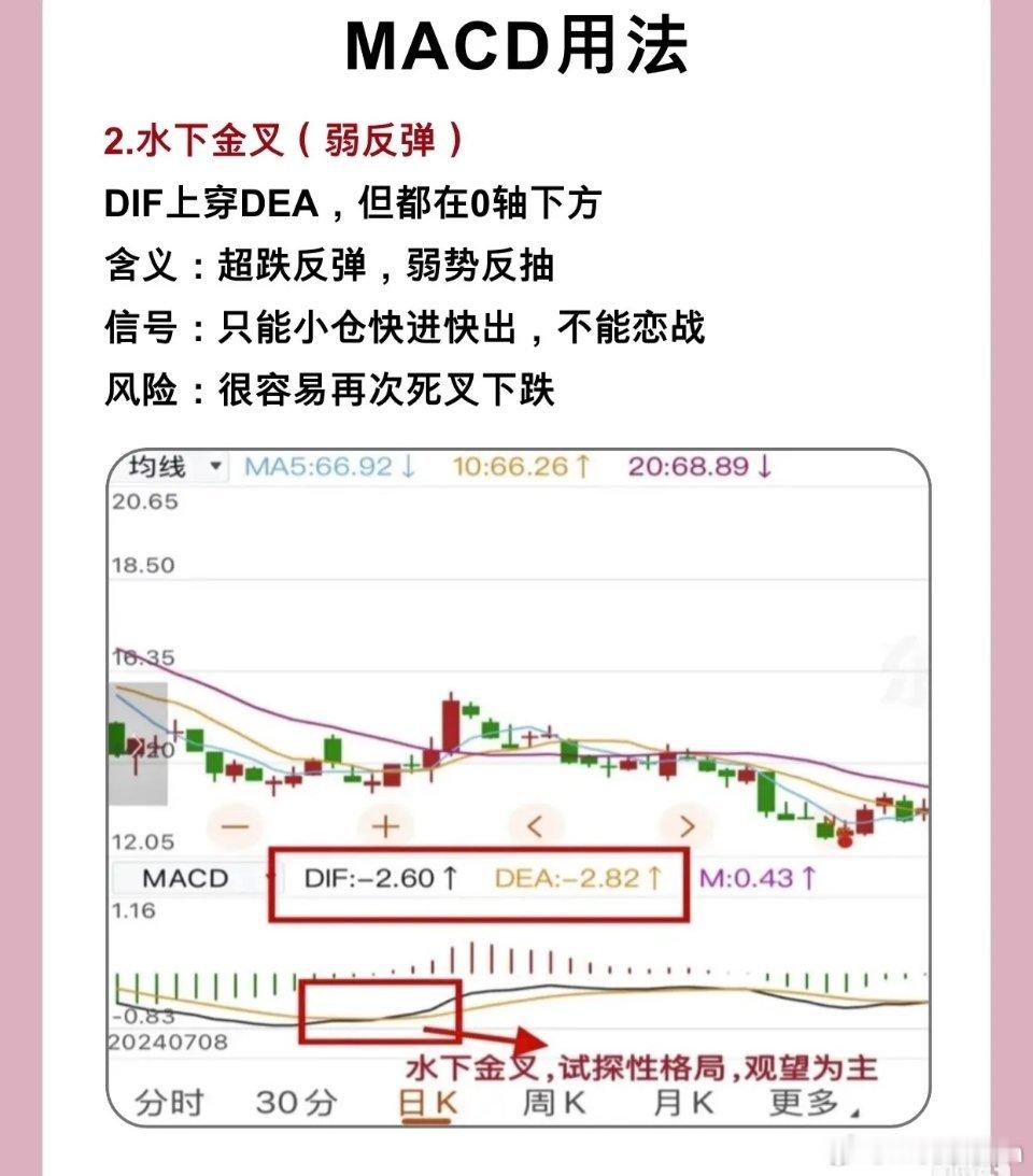 - 形态:DIF上穿DEA,但两条线都在0轴下方。- 含义:股价处于空头趋势(“水下”=空头主导区间),金叉是超跌后的弱势反抽(非趋势反转)。- 信号风险:反抽力度有限,容易再次死叉下跌(反弹后再创新低概率高)。- 交易策略:仅适合小仓位快进快出,不可恋战,观望为主更安全。