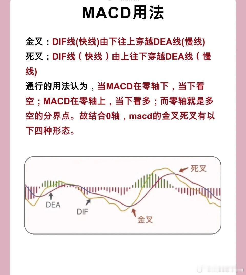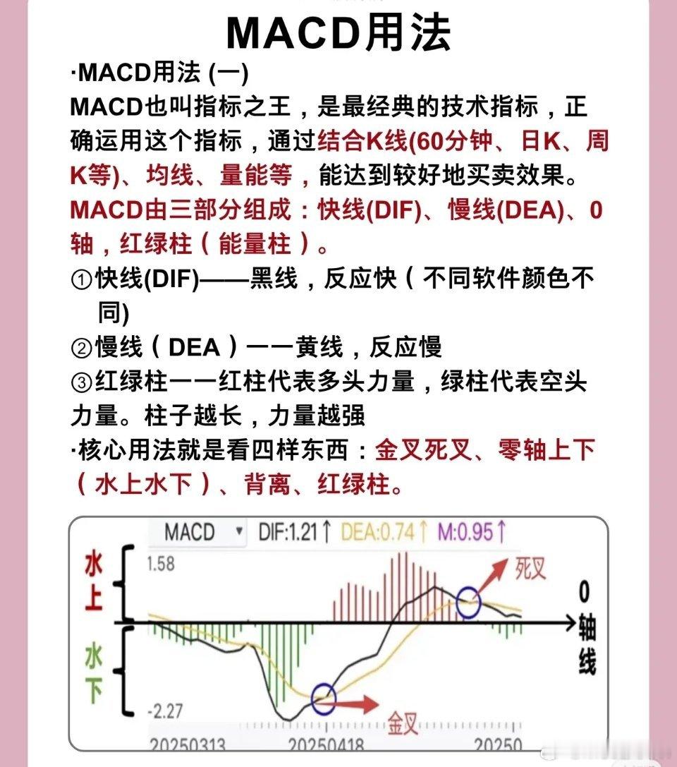 - 金叉/死叉(DIF与DEA的交叉关系)- 零轴上下(多空分界,“水上”=0轴上,“水下”=0轴下)- 背离(价格与指标的背离,判断趋势反转)- 红绿柱(能量强弱的直观体现)