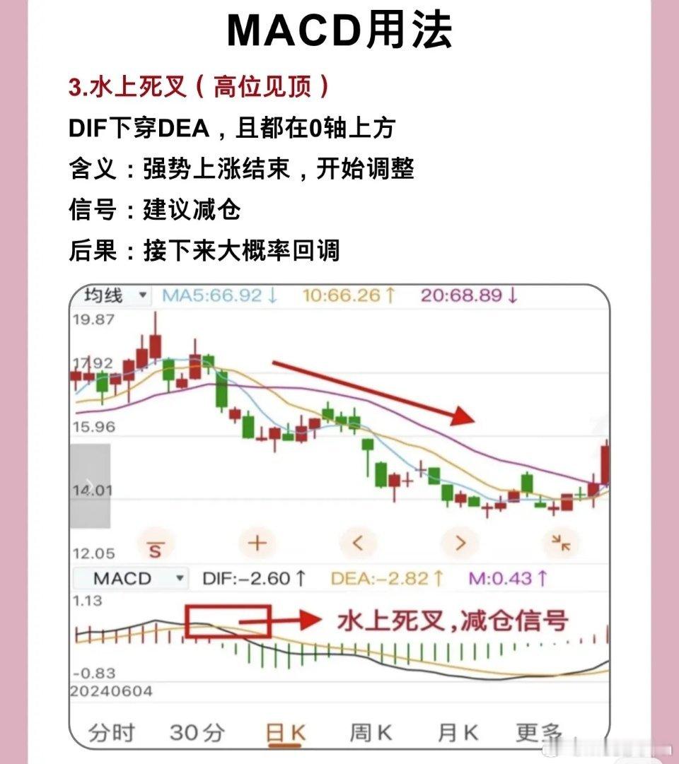 - 形态:DIF下穿DEA,且两条线都在0轴上方。- 含义:股价处于多头趋势,但上涨动能衰竭,强势上涨阶段结束,进入调整周期。- 信号意义:明确的减仓信号,趋势由强转弱的转折点。- 后续走势:大概率伴随回调,需及时止盈或减仓。