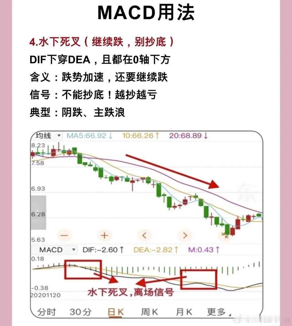 - 形态:DIF下穿DEA,且两条线都在0轴下方。- 含义:股价处于空头趋势,死叉是跌势加速的信号(空头力量进一步强化)。- 信号意义:坚决不能抄底!越抄越亏(阴跌、主跌浪的典型信号)。- 交易策略:离场信号,规避后续下跌风险。