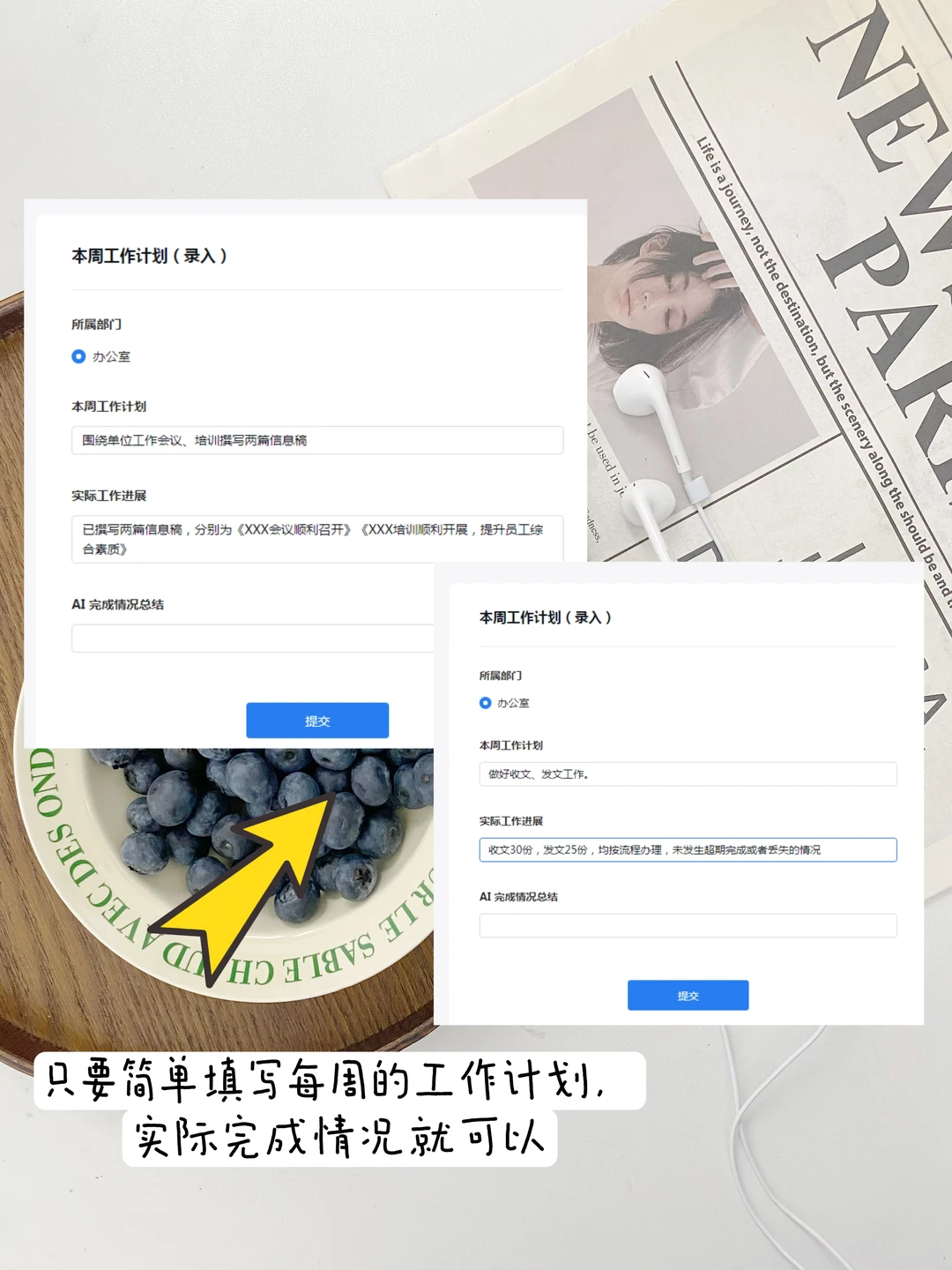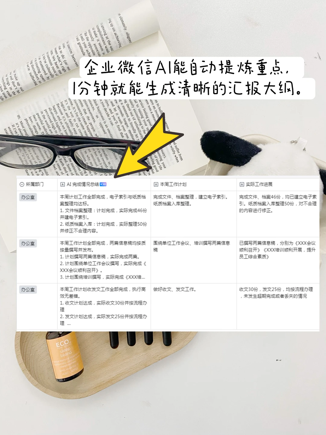 近期我使用了企业微信AI来总结,把工作任务表分发给科室小伙伴们,他们只要简单填写每周的工作计划,实际完成情况就可以,企业微信AI能自动提炼重点,1分钟就能生成清晰的汇报大纲。
