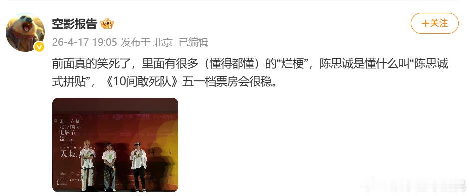 陈思诚回应电影被说拼贴 能坦然接受不同声音,还保持轻松心态🙂陈思诚的格局真的很大,不被争议影响,专注做好自己的电影