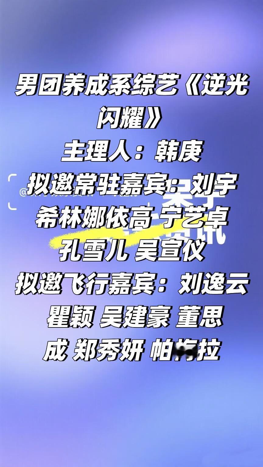 养成系男团综艺《逆光闪耀》来了主理人:韩庚拟邀常驻嘉宾:刘宇 希林娜依高 宁艺卓 孔雪儿 吴宣仪拟邀飞行嘉宾:刘逸云 瞿颖 吴建豪 董思成 郑秀妍 帕梅拉播出时间:四季度晚间档播出由雷霆主理人韩庚携手12位花样少年共同经营一间舞房!