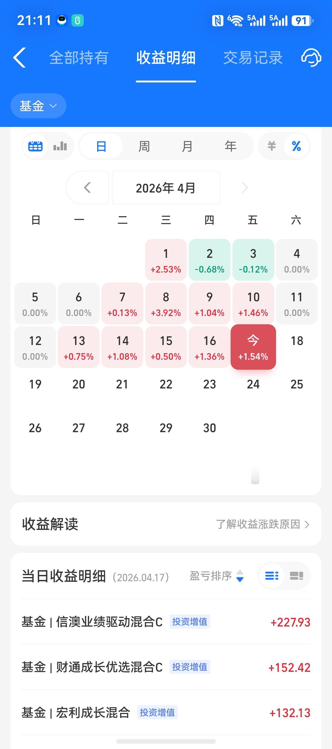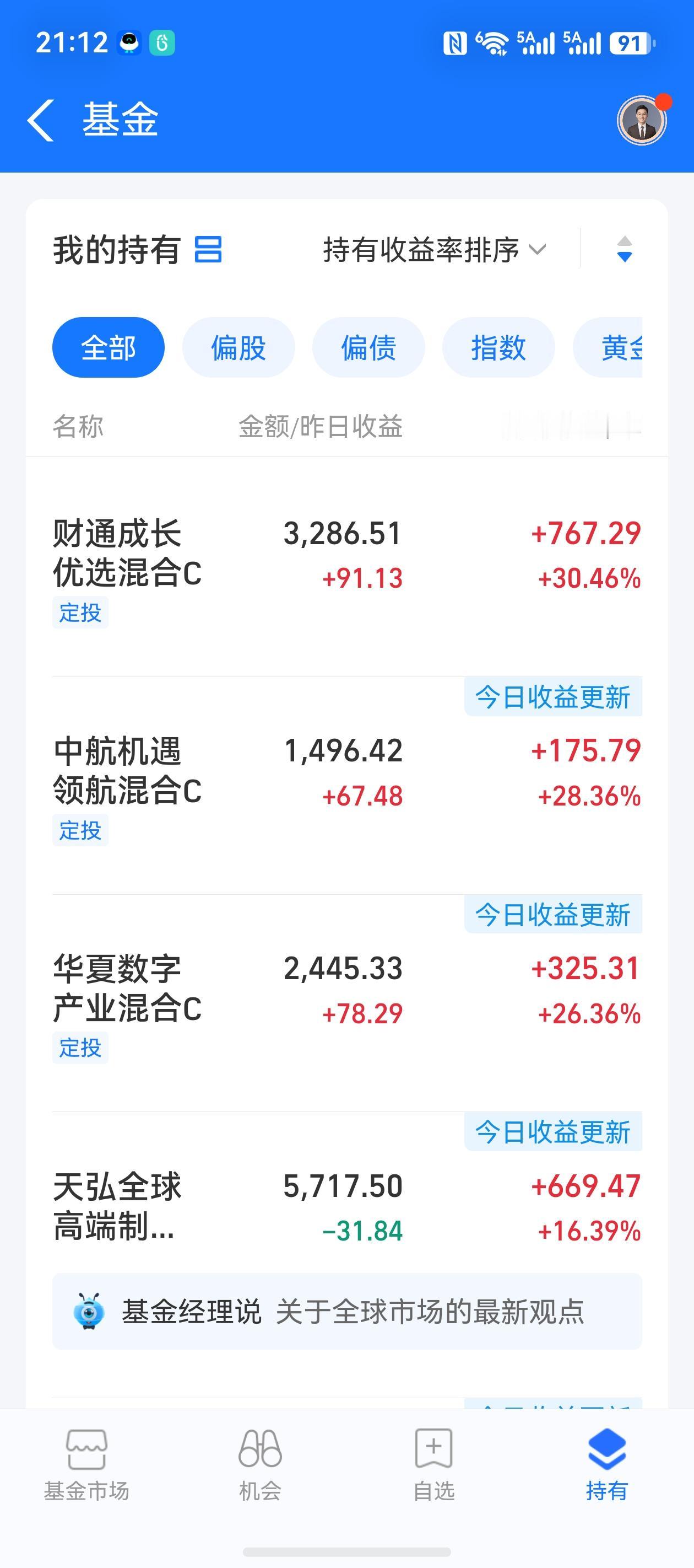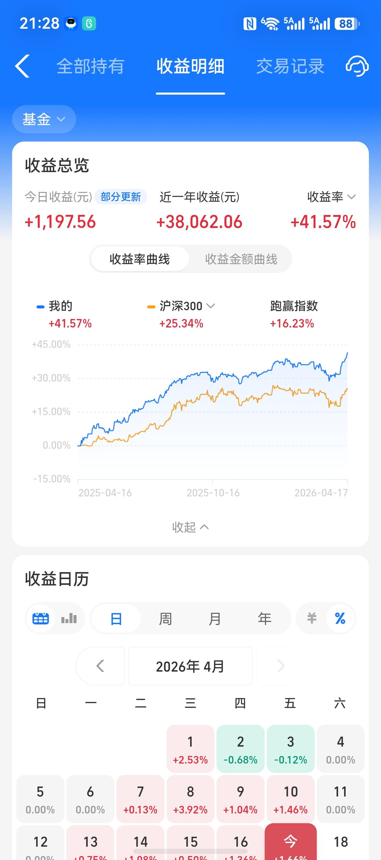 今日基金收益1100元,近一年收益率41.57%,今年收益率8.82%,连续九天正收益。今日操作继续止盈财通成长、中航机遇、华夏数字 ,加仓医药、航天。个人操作记录,不构成操作建议!