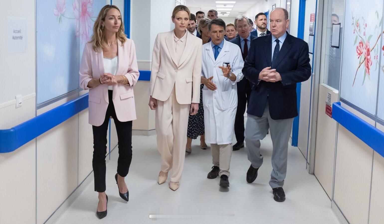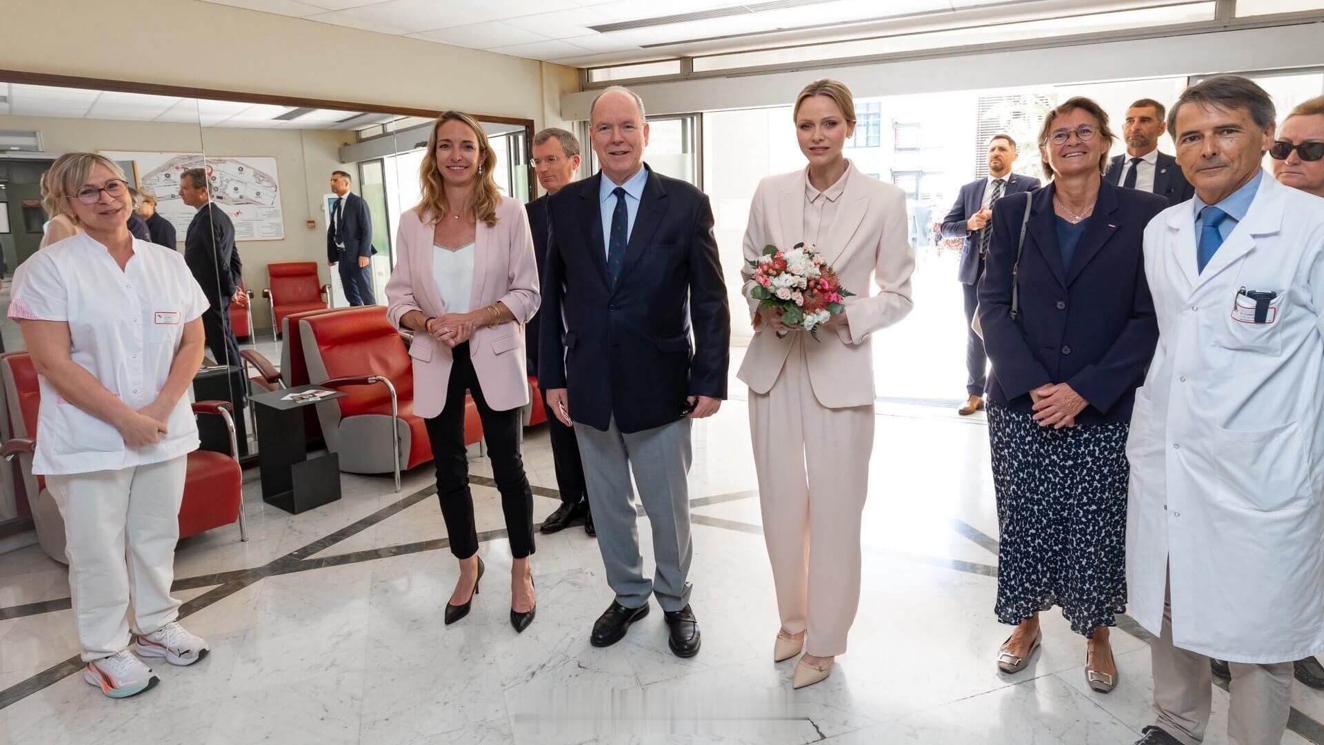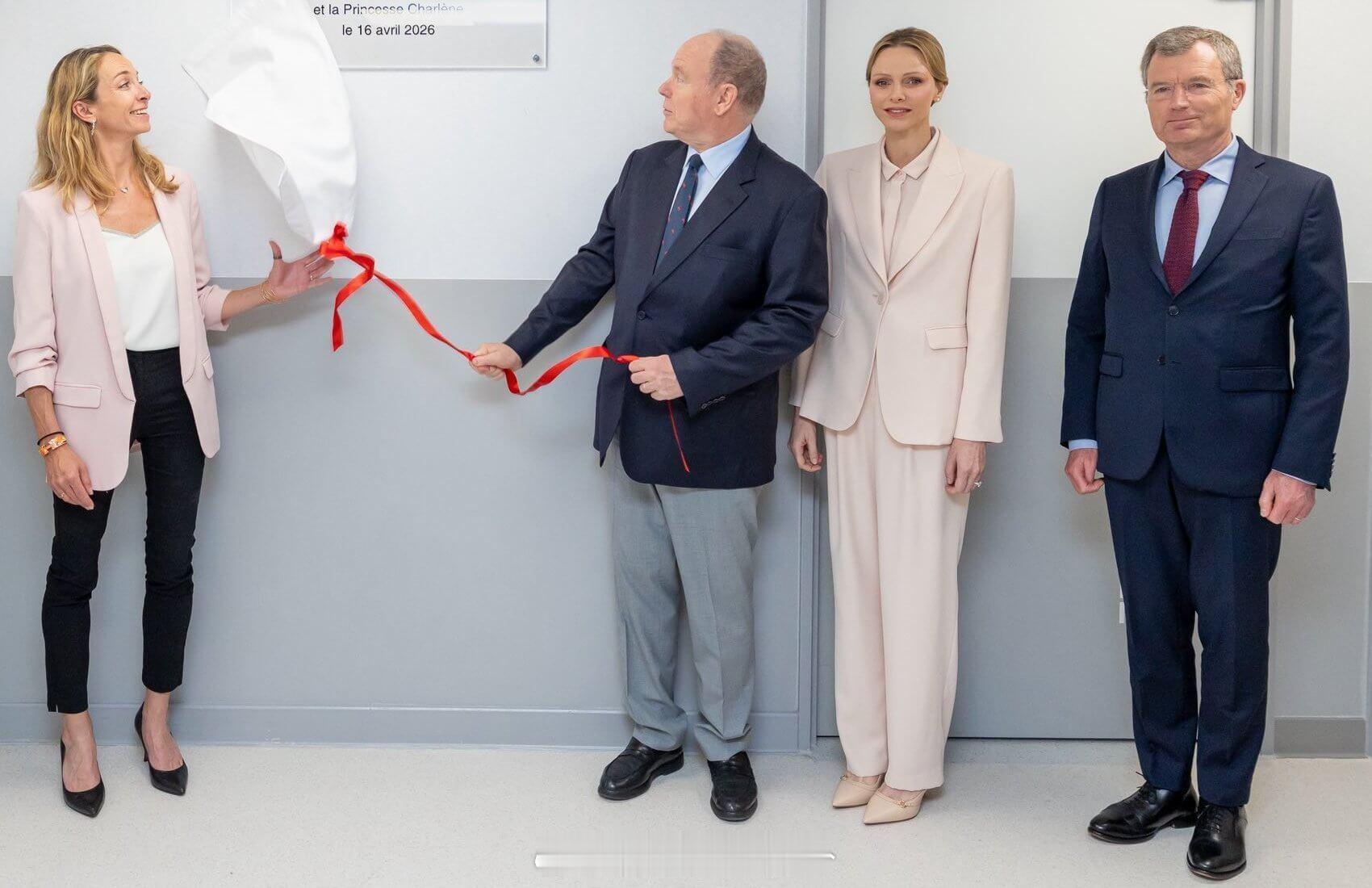 4.16 摩纳哥亲王阿尔贝二世和王妃夏琳为格蕾丝王妃医院新的妇产科大楼揭幕,夏琳裤装来自阿玛尼