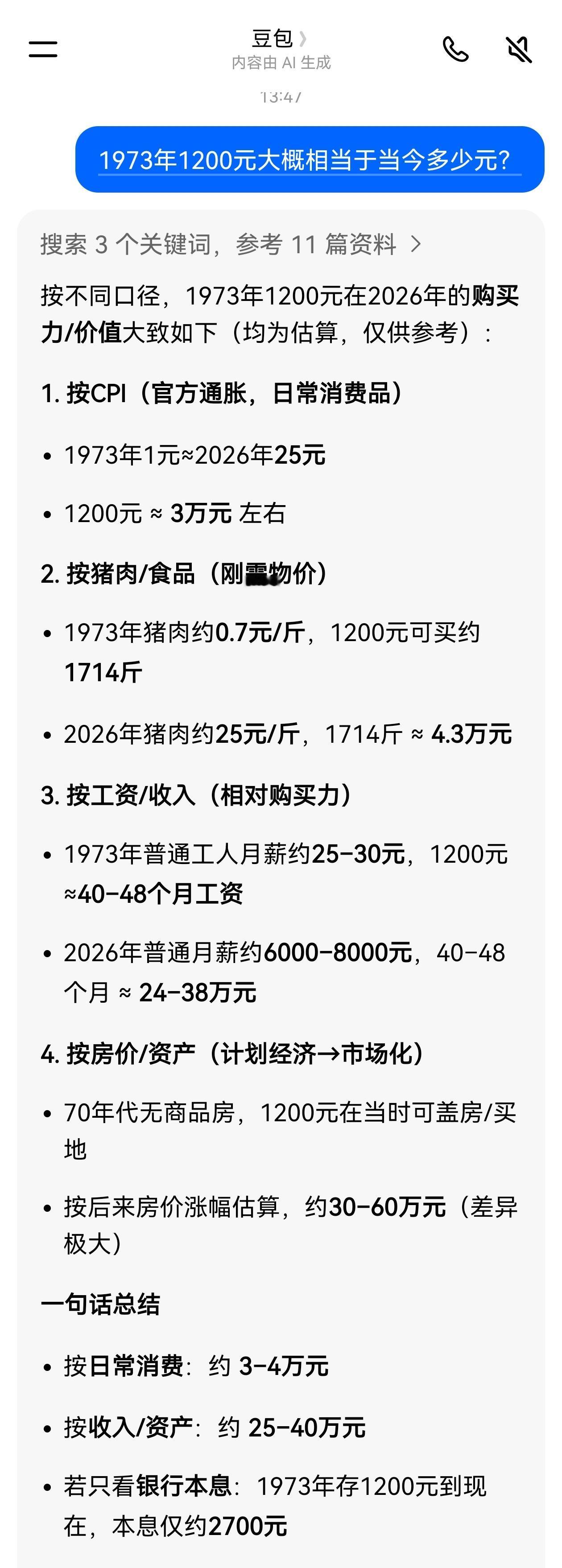 1973年的1200元确实是一笔大额资金了。让豆包给大概估算了一下,显而易见,放