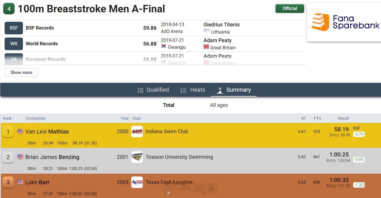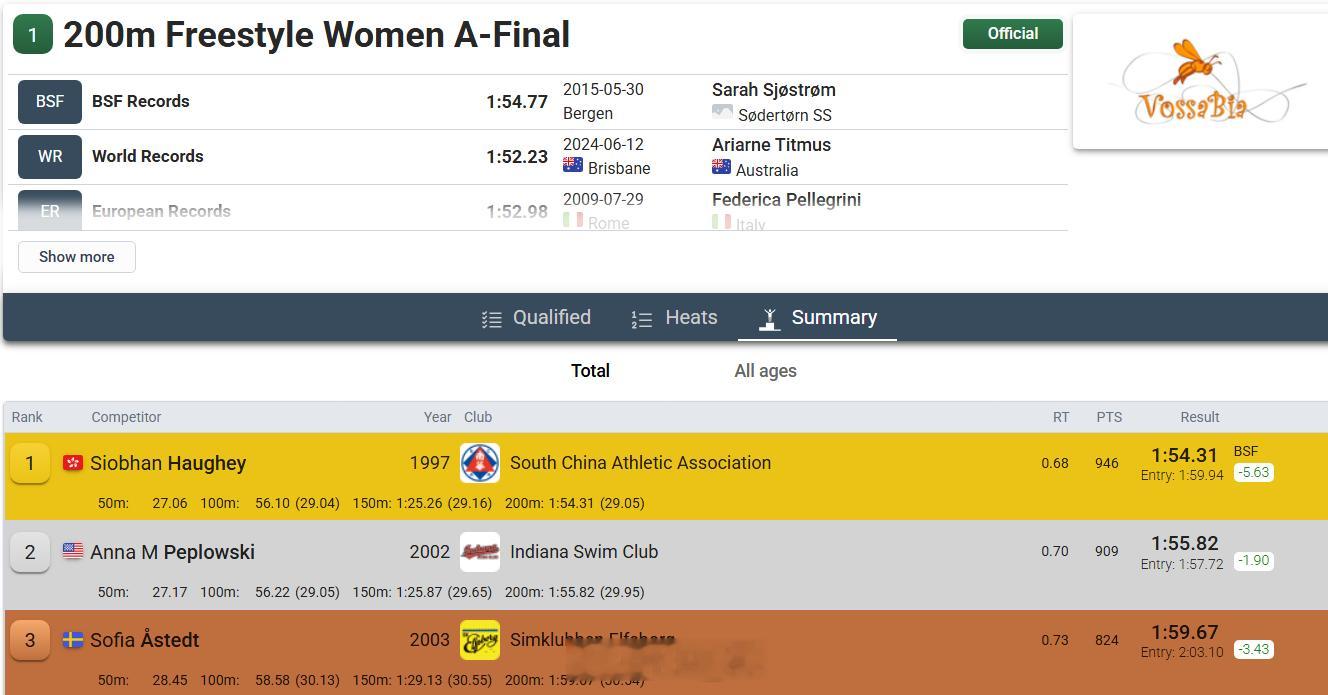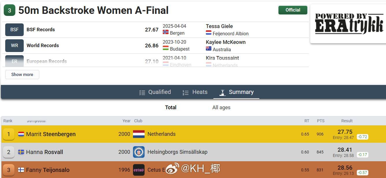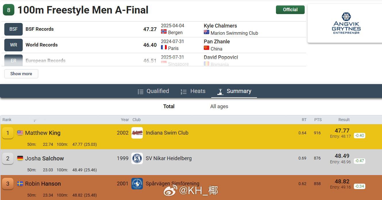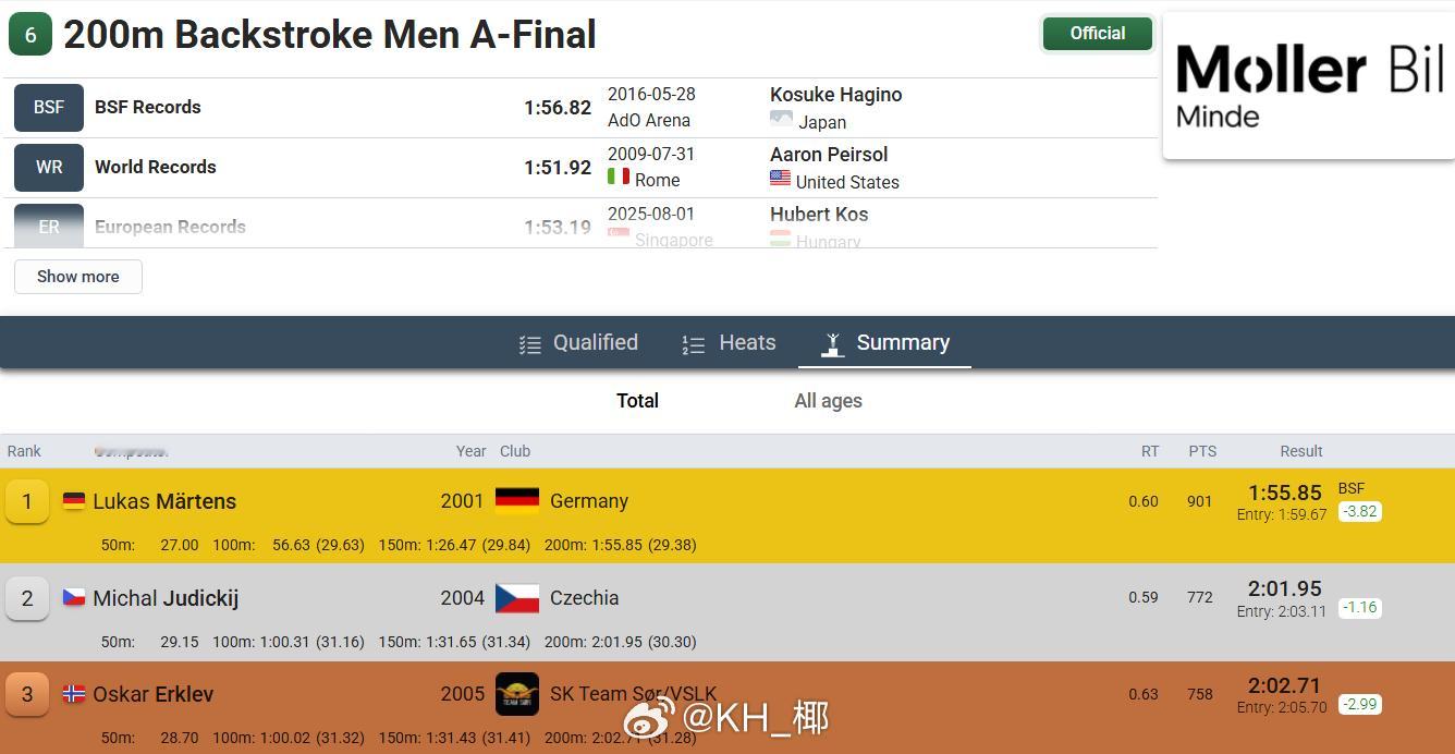 Bergen Swim Festival 第一天决赛男100蛙:🇺🇸Van Mathias 58.19 PB男100自:🇺🇸Matt King 47.77 PB 男200仰:🇩🇪Lukas Martens 1:55.85 PB男200蝶:🇺🇸Dare Rose 1:55.64女200自:🇭🇰何诗蓓 1:54.31女50仰:🇳🇱Marrit Steenbergen 27.75