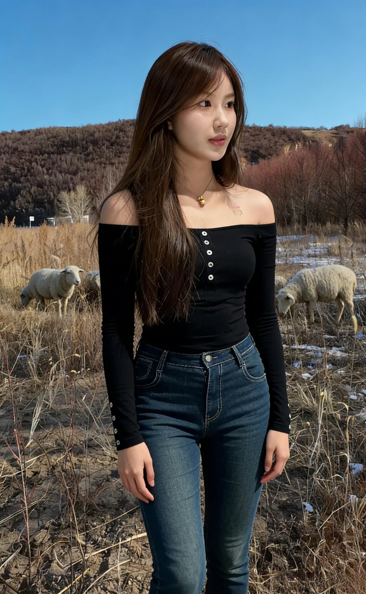 荒草与白羊铺展辽阔 黑衫露肩衬尽烟火 风掠过发梢的那一刻 侧脸写满自由与青涩