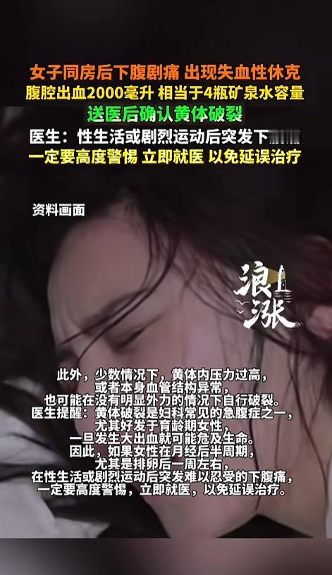 信息来源:《女子同房后下腹剧痛 出现失血性休克 送医后确认黄体破裂》浪涨新闻