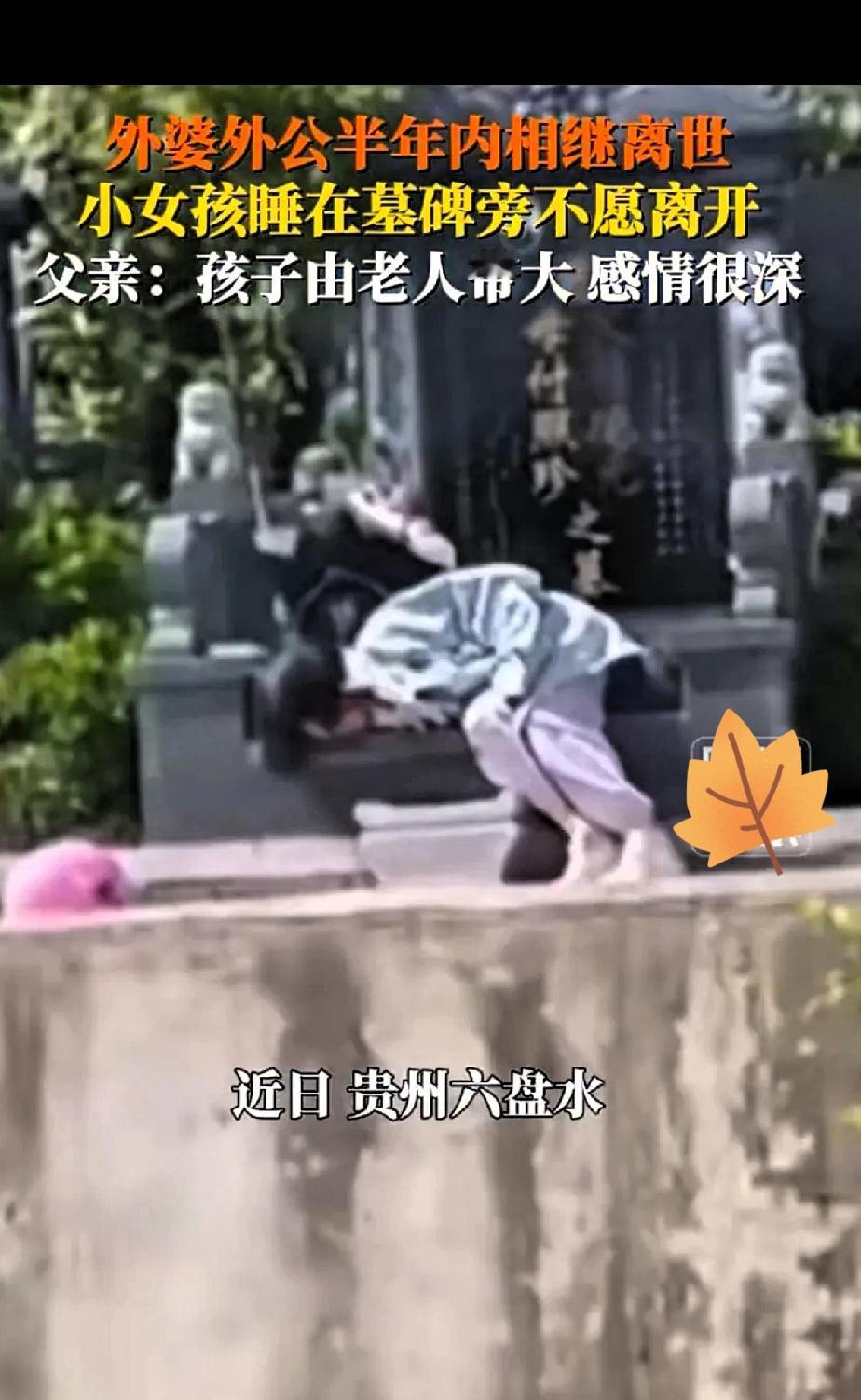 贵州六盘水。女孩思念外公外婆睡在墓碑旁,5个月前,女孩的外婆突发疾病离世,20多天后外公也因心梗匆匆走了。因思念外公外婆,小女孩睡在墓碑旁久久不愿离开。