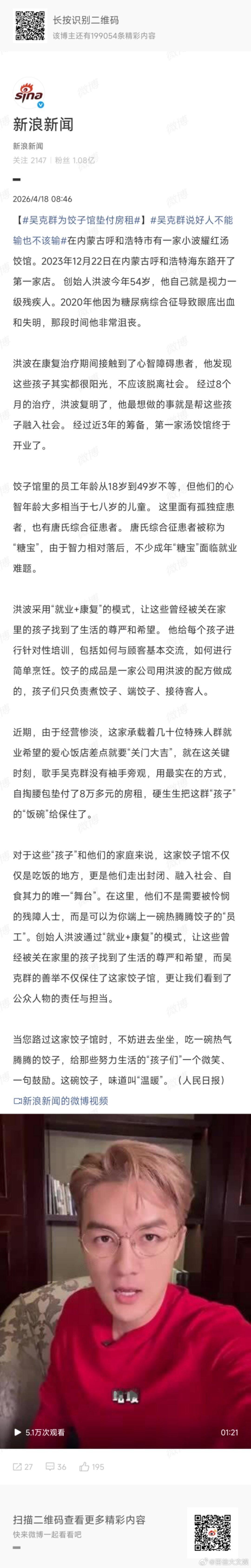吴克群说好人不能输也不该输吴克群为饺子馆垫付房租 真的被吴克群暖到了!他说“好人不能输也不该输”,不是嘴上说说,直接自掏腰包给爱心饺子馆垫房租,实打实护住了几十位特殊员工的饭碗。