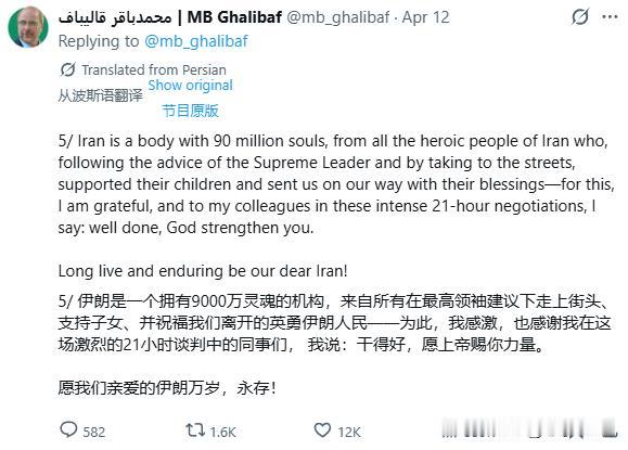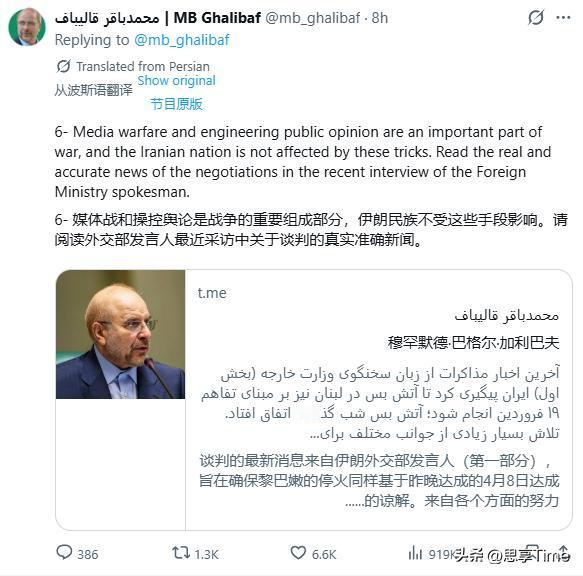 伊朗议长卡利巴夫在社交媒体甩出一句话:“特朗普在1小时内发布的7项声明,均不属实。”