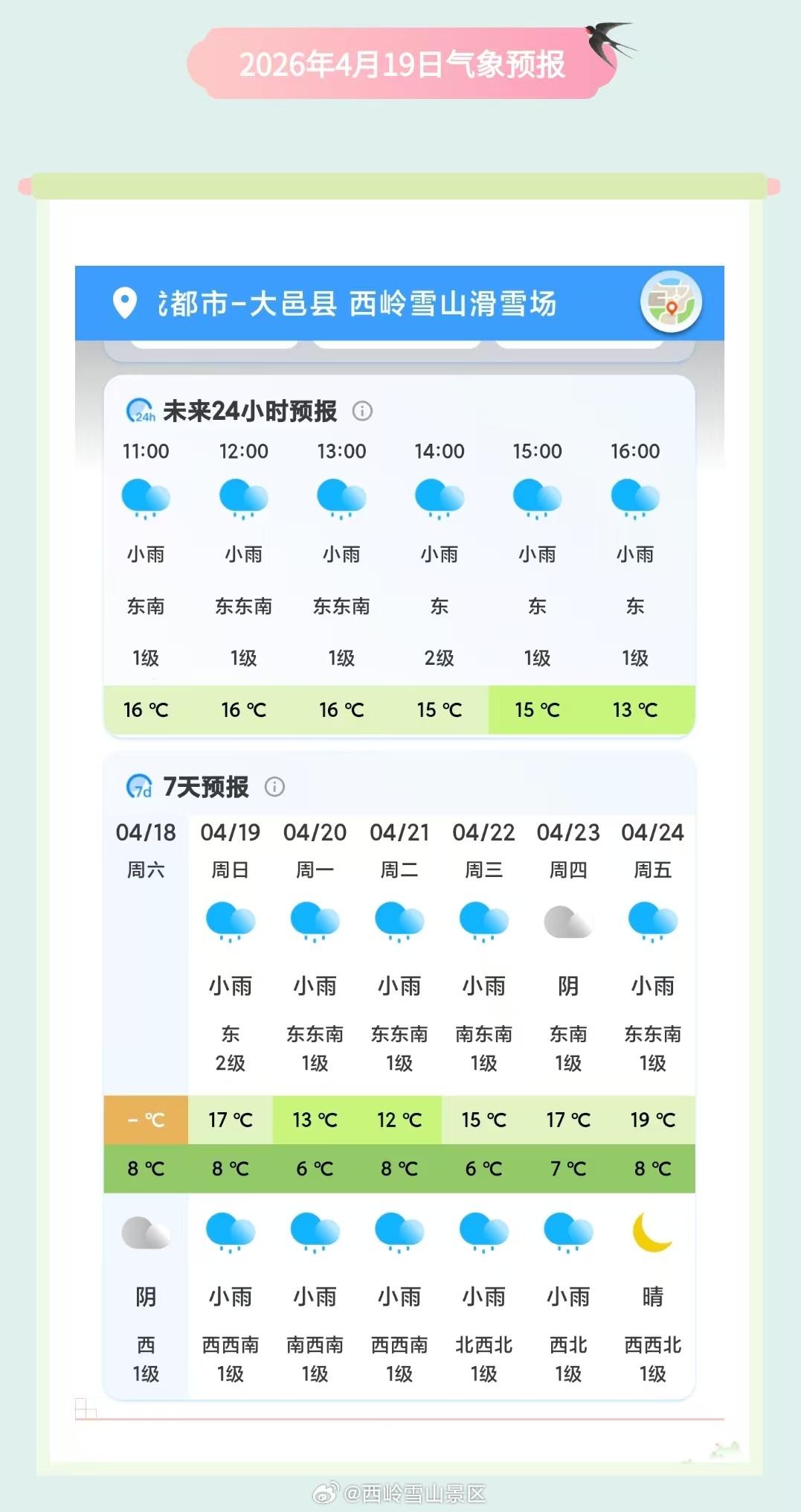 西岭雪山4月19日(周日)气象预报#西岭雪山 #