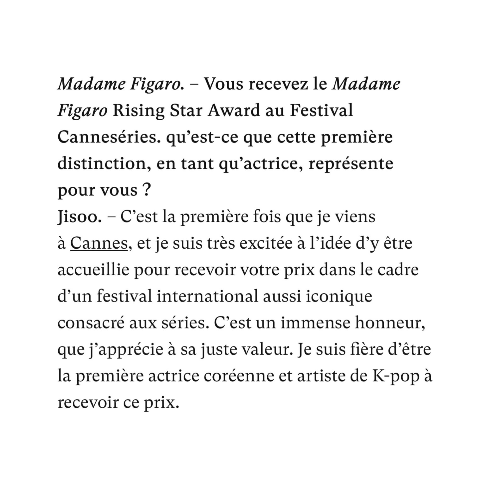 JISOO 谈戛纳系列奖:“这是我第一次来到戛纳,能够在这个极具象征意义的系列国际电影节上受到大家的欢迎并领取奖项,我感到非常兴奋。这是莫大的荣誉,我由衷地感谢大家。作为首次获得该奖项的韩国女演员兼 K-pop 艺人,我感到十分自豪。”