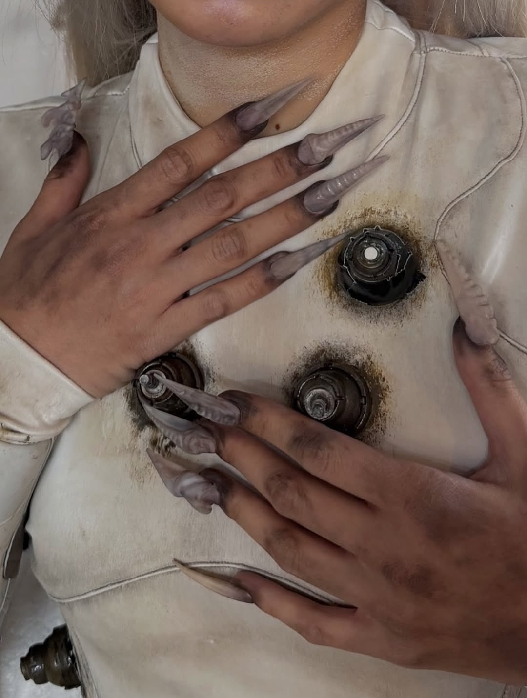 “以椎骨为灵感设计的美甲,为 lalalalisa_m 与 anyma_eva 合作的作品《BAD ANGEL》MV 及视觉画面所用,产品使用 apresnailofficial。化妆:iammaeng,美甲:byjuanalvear,发型:parizhair,造型:nanist。”