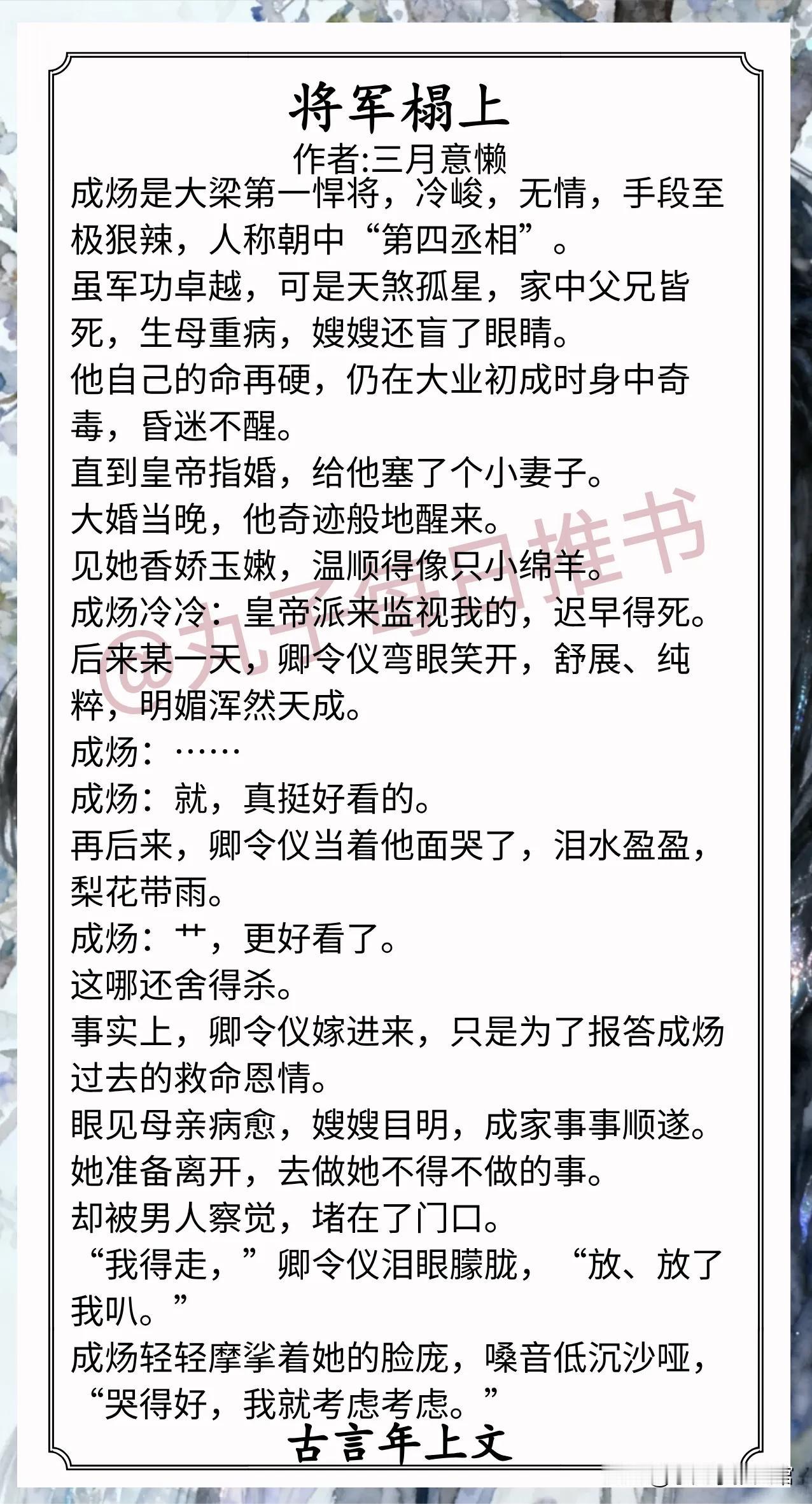 7.《将军榻上》作者:三月意懒(娇软泪失禁美人vs疯批美强惨将军,先婚后爱,古言甜宠文,年上)