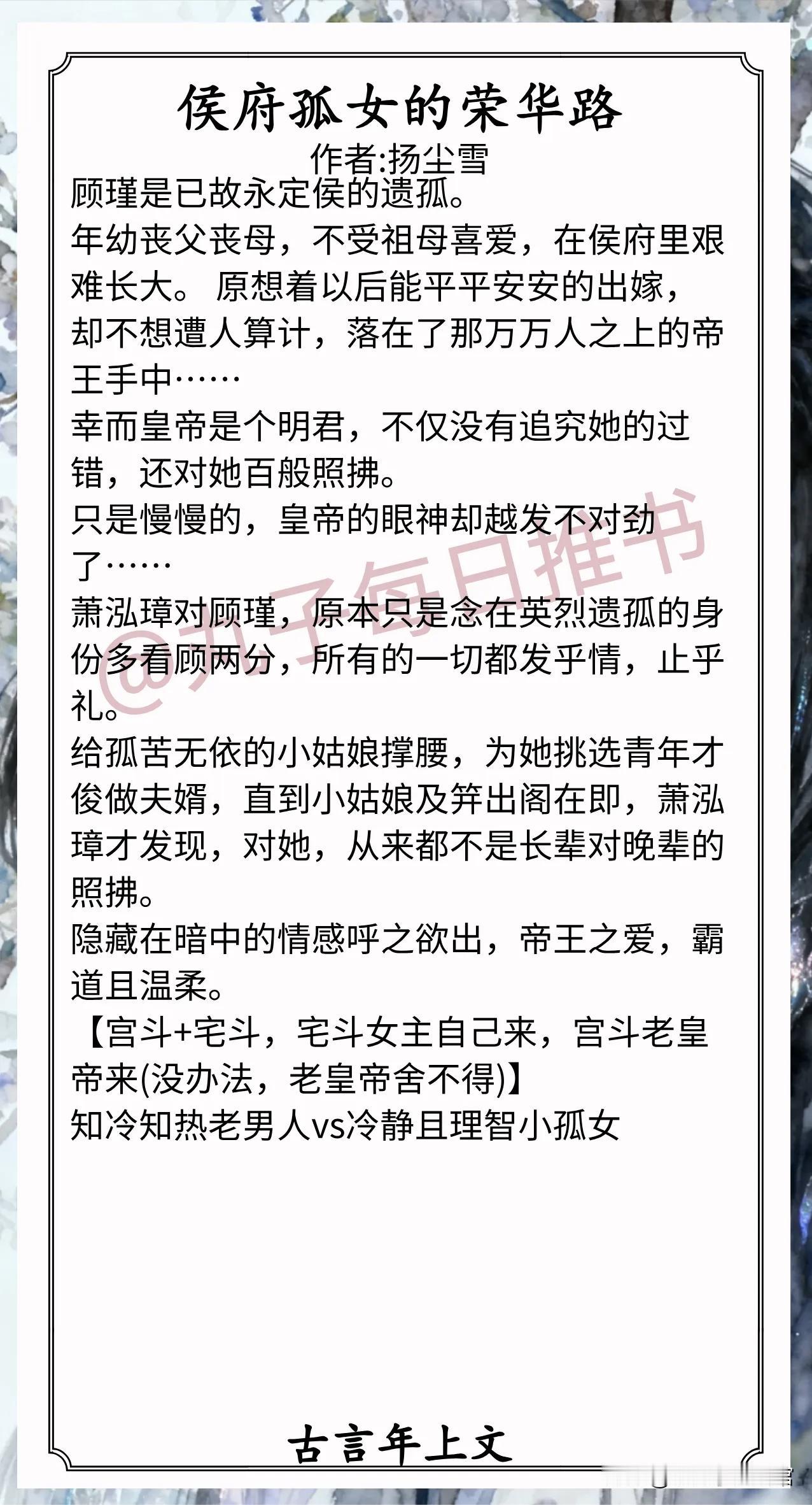 4.《侯府孤女的荣华路》作者:扬尘雪(孤女vs帝王,养成,男宠女,年龄差)