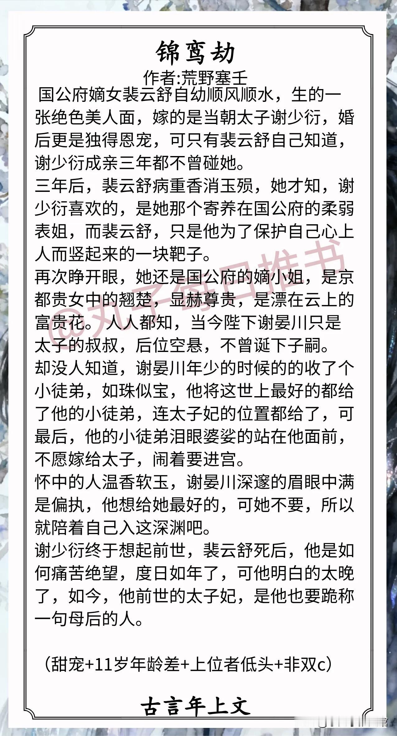 8.《锦鸾劫》作者:荒野塞壬(国公府嫡女vs温柔帝王,重生,男宠女,渣男扬灰)