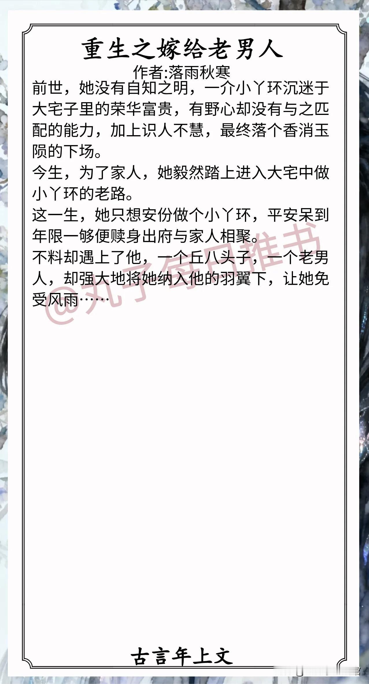 9.《重生之嫁给老男人》作者:落雨秋寒(老实小丫鬟vs外表粗犷实则温柔老男人,重生,日久生情,家长里短)小说 推文