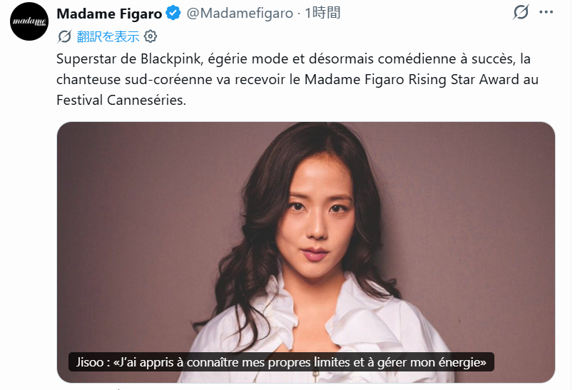 “Blackpink 的超级明星、时尚代言人,如今又是成功的演员——这位韩国女歌手将在戛纳电视剧节上荣获《费加罗夫人》新星奖。”