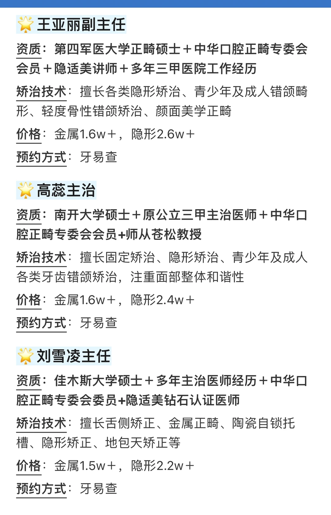 📍私立我都是选择的资质背景比较资深的医生,大家也可以在[向右R]牙易查小程序里自行搜索,分类很清晰,输入自己的诉求或想了解的正畸方向就可以查到!🔘这次具体面诊了六位私立医生,最终结合各位医生的案例、价格和方案等等因素,我是在和两位医生里面纠结,两位医生给我的方案都大致差不多,也在我的预算范围内。