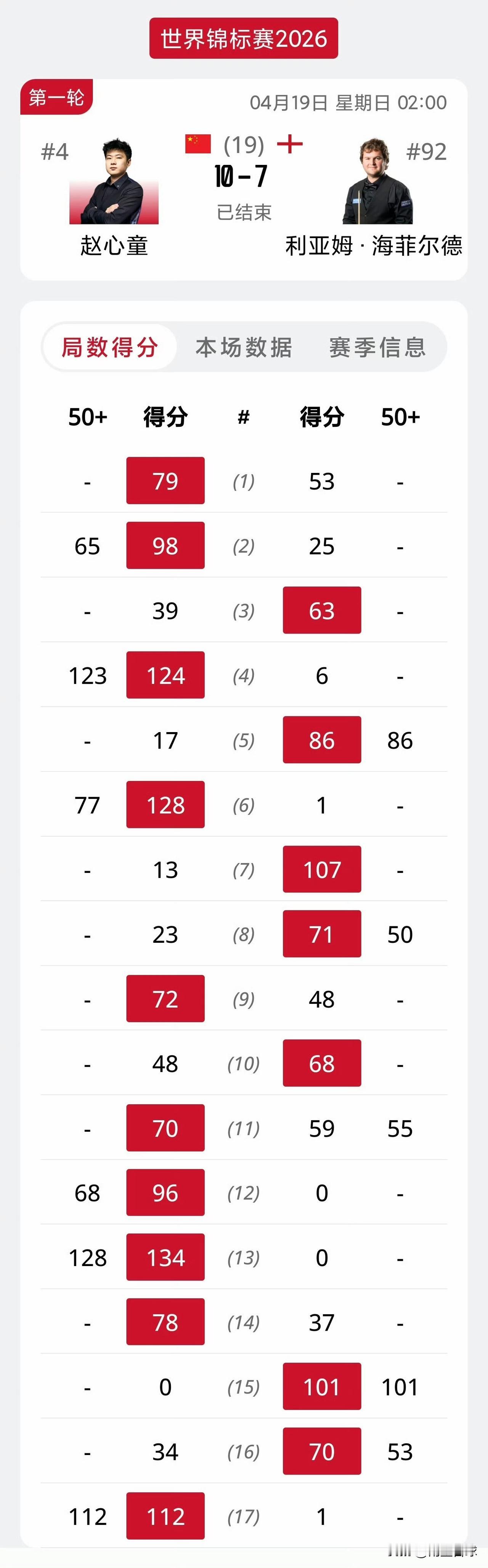 2026斯诺克世锦赛 32进16轮次,全场比赛赵心童打出三杆破百(123、128、112)和三杆50+(65、77、68),利亚姆·海菲尔德打出一杆破百(101)和四杆50+(86、50、55、53)