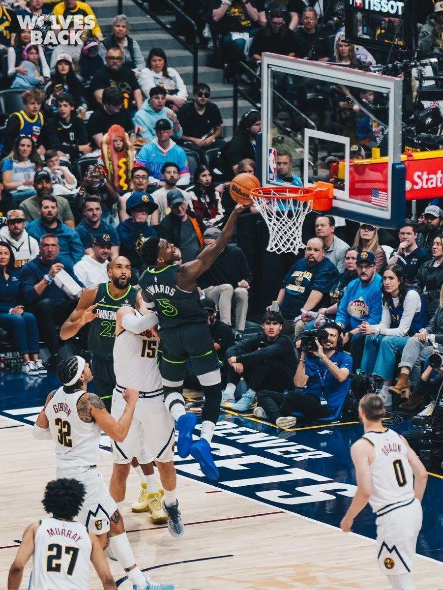 该说不说,森林狼今天打的不错,尤其头号球星爱德华兹,他在上半场对阵掘金的比赛中攻防两端均有统治级表现。
