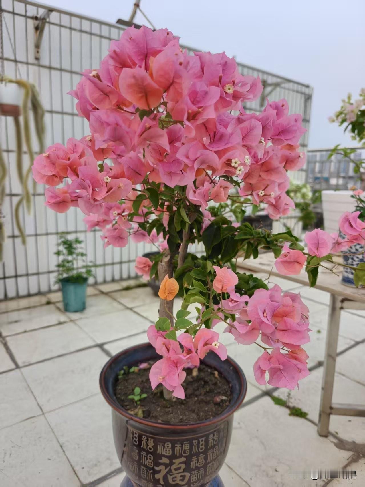 我家三角梅爆花啦,那景象简直绝了!满盆繁花似锦,橙色、浅粉交织在一起,像打翻了调色盘。