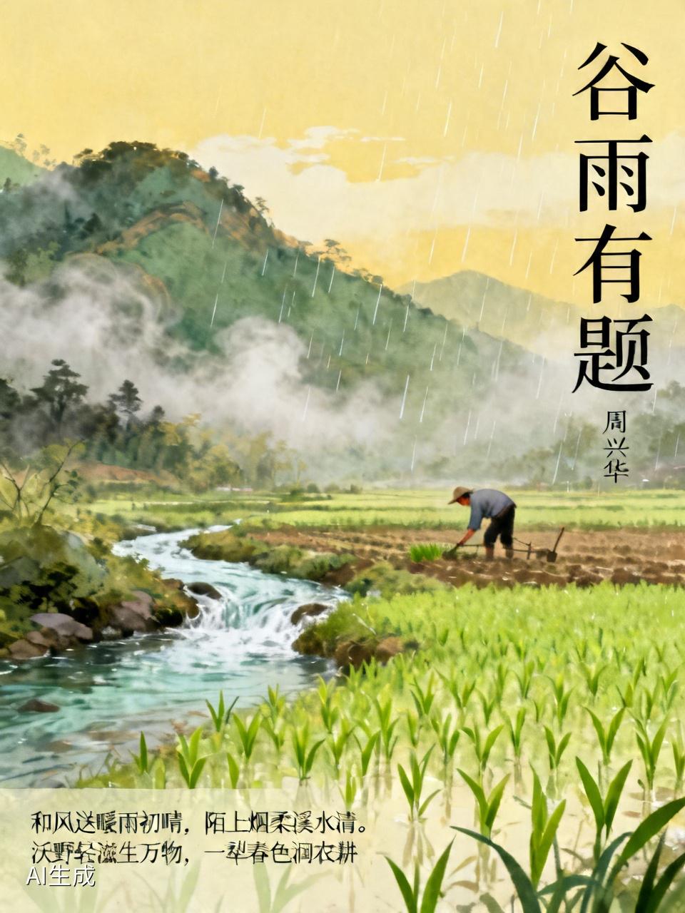 都说“谷雨”是一年中最好的雨,正值谷雨时节,每一场雨都在滋润大地,催农耕。走在乡间陌野,皆可见轻烟缭绕,山溪水清,农人繁忙。此时,一幅农耕图呈现眼前,即景吟首小诗乐一乐。
