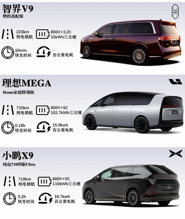 ✨ 核心小结,一眼对号入座 ● 要商务气场+无焦虑续航,注重高端质感,选智界V9(4月22日开启预订,展车下旬到店)[3]; ● 追求极致空间+低能耗,主打家庭出行,理想MEGA是不二之选; ● 看重科技质感+高性价比,家用商用两相宜,小鹏X9很香。