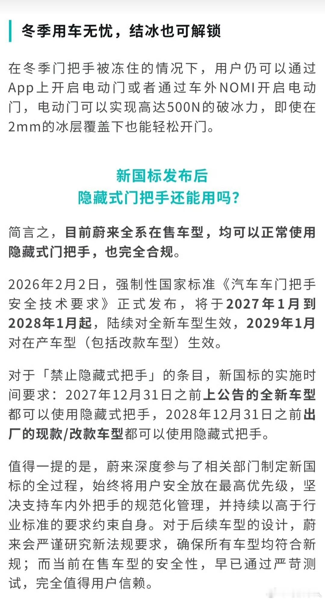 蔚来回应ES9仍用隐藏式门把手 很多人对这个隐藏式门把手有2个误区!首先,新规不是今年马上就禁用了,而是2027年底前公告的全新车型、2028年底前出厂的现款/改款车型,都还能正常用隐藏门把手,也就是2028年12月31日之前的新车依然能用,所以蔚来ES9法规上没问题的;其次,全隐藏式门把手也可以做内外机械开关,而不是做不了,没有法规以前是很多隐藏门把手压根没做机械开关,蔚来ES9的隐藏门把手内外都做了机械拉线解锁,极端情况哪怕门把手弹不出来,也能按压把手前后端拉开;说白了,新规不是否定隐藏门把手,而是淘汰那些没有应急机械结构的设计,因为某些品牌的问题给大家闻之色变了 蔚来回应ES9隐藏式门把手合规