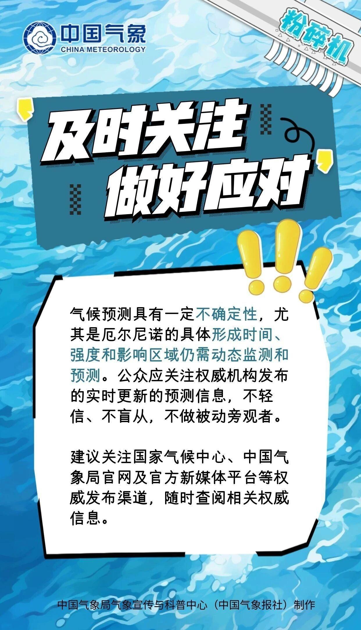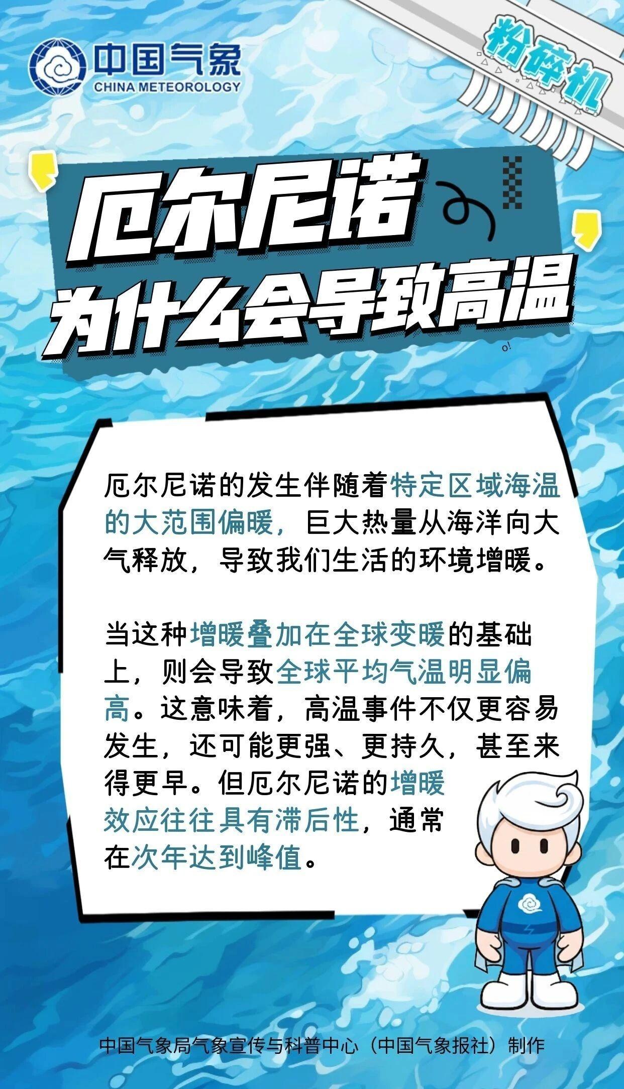 小布提示【“地球今年冲击高温极限”?权威回应!】近日,“140年以来最强级别厄尔尼诺”及其引发的全球高温影响等话题引发公众广泛关注。国家气候中心回应称,预计5月将进入厄尔尼诺状态,并于夏秋季形成一次中等及以上强度的厄尔尼诺事件,此次厄尔尼诺事件至少持续至今年年底。就“地球或今年冲击高温极限”的言论,国家气候中心专家表示,考虑到厄尔尼诺影响的滞后性,现在断言还为时过早,但相关风险在显著上升。(人民网)