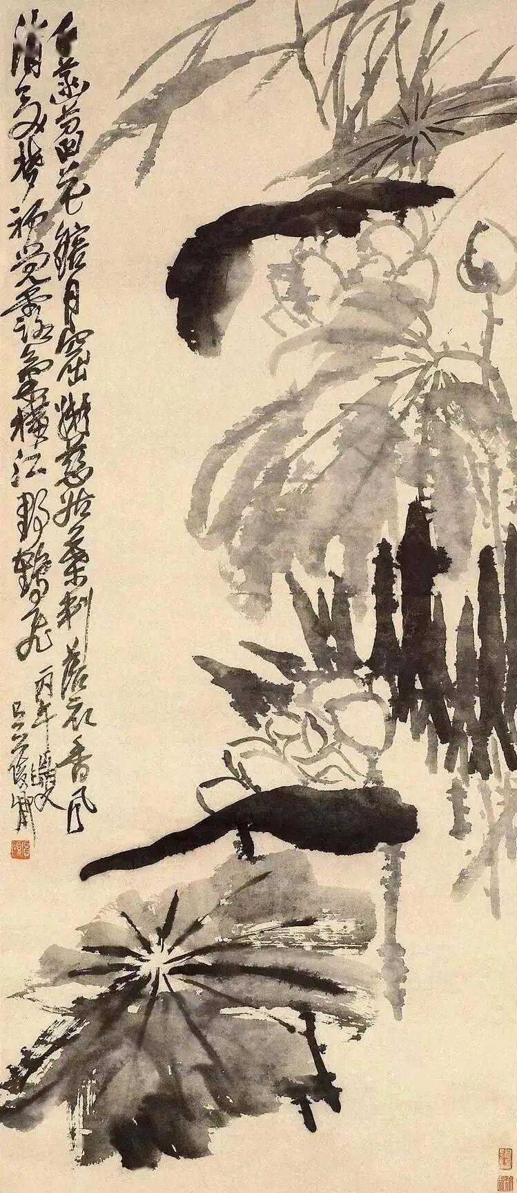 吴昌硕画荷。吴昌硕绘画题材以花卉为主,亦偶作山水。前期得到任颐指点,后又参用赵之
